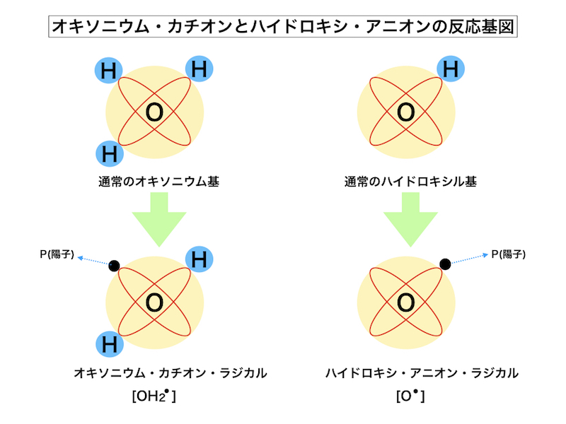 水素原子から軌道電子が突然いなくなってしまえば、突然原子磁場(電子の軌道磁界)が失われて、電子バイオンも飛び散り、水素原子は単独の陽子だけの存在となってしまいます。水分子(2H2O)は普段、仮に「OH3―OH」の状態で存在しており、そこに放射線を照射すれば、軌道電子を失った「OH2・」とか「O・」という物質が形成されてしまいます。「・」とは素粒子の陽子の事です。酸素原子の化学反応点(極部)に、水素では無く素粒子の陽子が結合しているという異常な状態、その状態を呈する物質を宇宙では一般に「素粒子ラジカル」と称しており、本来の酸素原子の約30万倍の電磁力を有する「お化けラジカル」の出現となります。物理学的には回転半径が小さくなればなる程磁束密度が高じる為に、陽子と結合した酸素極の電磁力が跳ね上がるのが原因しております。水に放射線を浴びせて被爆水を作り出すと、水の内部に「オキソニウム・カチオン・ラジカル(OH2・)」や「ハイドロキシ・アニオン・ラジカル(O・)」が誕生し、それらが互いの電子を奪い合う光景が見られます。