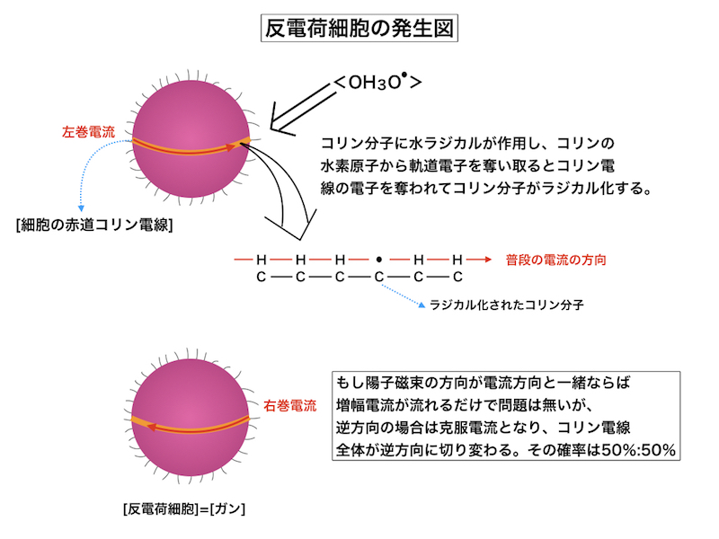 下記の図はグルコース・ラジカルが引き起こす蛋白質の糖化反応ですが、目の網膜細胞の光アミロイド蛋白と結合して目から明るさを奪ってしまう行程図です。またもう一つの図は白血球細胞を水ラジカルが襲って、白血球の赤道コリン電線の不可逆的な電流方向を無理やり切り替えてしまい、反電荷細胞が誕生する際の図です。いわゆる癌細胞の発生メカニズムですが、癌発生がDNA異常で起こるものでは無く物理的な要因で起こる事を知って欲しいと思います。