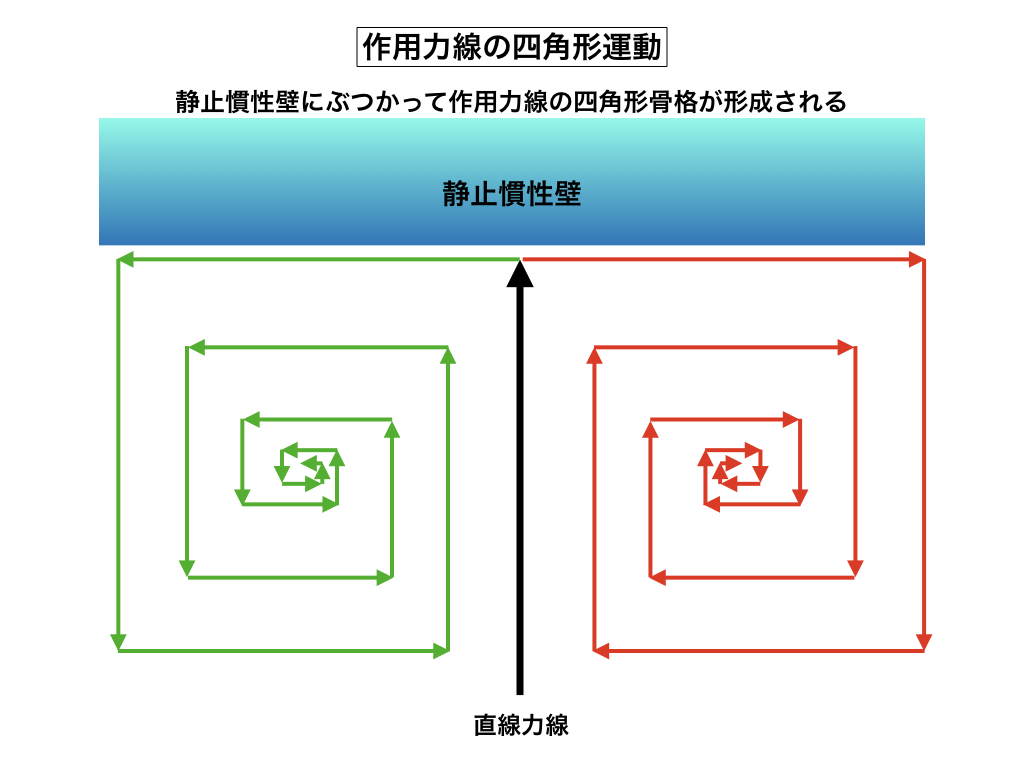 では、次に宇宙空間に発生した渦巻を考えてみましょう。一個の外殻電子が回転しただけでも「テトラ力体」が形成され、内部重力が発生するのに、複数の渦層が同時に回転する場合はどうなるのでしょうか。そもそも渦回転とは一体どうして起こるものなのでしょうか。宇宙空間の中を直線力線が走ると、「静止慣性壁(大宇宙空間力場=反作用場)」に衝突した力線が折れ曲がって、左右の四角形渦が瞬間的に誕生して来ます。それは力線が100億分の1秒という短時間に描き出す回転渦巻体ですが、そこに気流が流れ込んで実際の渦運動が後から発生して来ます。風呂のお湯の中に手を入れて、ゆっくりと水に直進運動を起こさせると、左右の双子渦が同時に誕生して来ますが、その原理とは風呂の表面に瞬間的に力線の四角形渦が誕生し、その回転力に乗じて水流の渦巻運動が後から起こって来るというものです。渦巻は一見、平面運動に見えますが、実は四角形渦の段階から立体を形成しており、それを渦巻のテトラ回転体と言います。渦層が12個あれば、当然12個のテトラ力体が同心球状に連なって(極を連ねて)回転している事になります。それが最初に形成される力場骨格(容器)であり、その後から流動体(中身)が回転して形成される磁場が出来、二種類の性質を呈示する事になります。力場と磁場は容器と中身の関係と言えます。