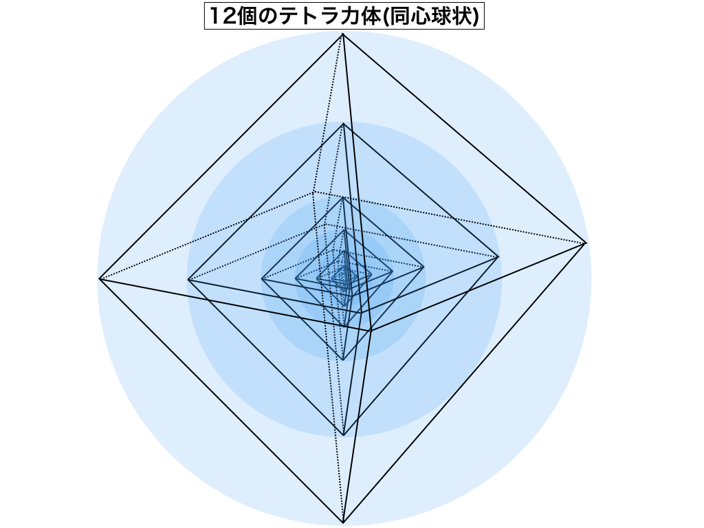 発生したばかりの求核渦の段階では激しい反発力と激しい重力を呈する渦巻ですが、回転力が衰えて等速度運動に近づいて来ると、12個のテトラ体は最終的に二つに集約されて、一番外側(第12磁界の外)の「外テトラ」と内側(第6磁界の内部)の「内テトラ」になります。地球の場合は「内テトラ」が第6磁界の中間点付近に形成されており、それが重力と磁力(斥力)の分水嶺となっています。生物の心活動に関係するネブヤハゲル層は「外テトラ」の最上階に位置し、現在はその力学骨格が解け出している為に、上位三階(第12磁界と第11磁界と第10磁界)の瓦解が危惧されている状況です。「内テトラ」と「外テトラ」の体積比は1∶180であり、内テトラの内部では重力が働き、また外テトラの内部(内テトラの外部)では斥力が働いています。これらの関係は太陽系でも一緒であり、太陽系の第6磁界は火星の公転軌道よりもほんの少し内側に位置しており、この領域に太陽系の内テトラ球が存在します。この線より内側は太陽系の重力圏、外側は磁力圏を呈しています。テトラ力線回転体には回転による遠心力が付加されて、正八面体の形状が一見すると球体に見えるのですが、よく見ると完全な球体ではなく、極半径が小さく赤道半径が大きい楕円球体であって、歪な形状を呈しています。また赤道部の渦巻本体も、力線の集中点と渦層回転(子星の公転軌道)の中心点(回転軸)が離れて存在しており、完全無欠の円運動とは異なります。