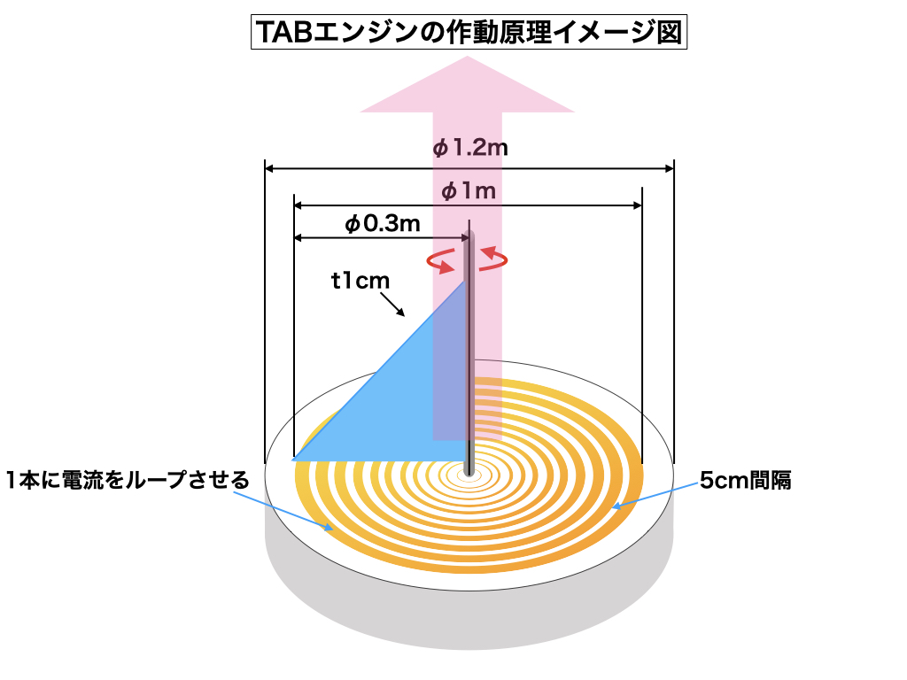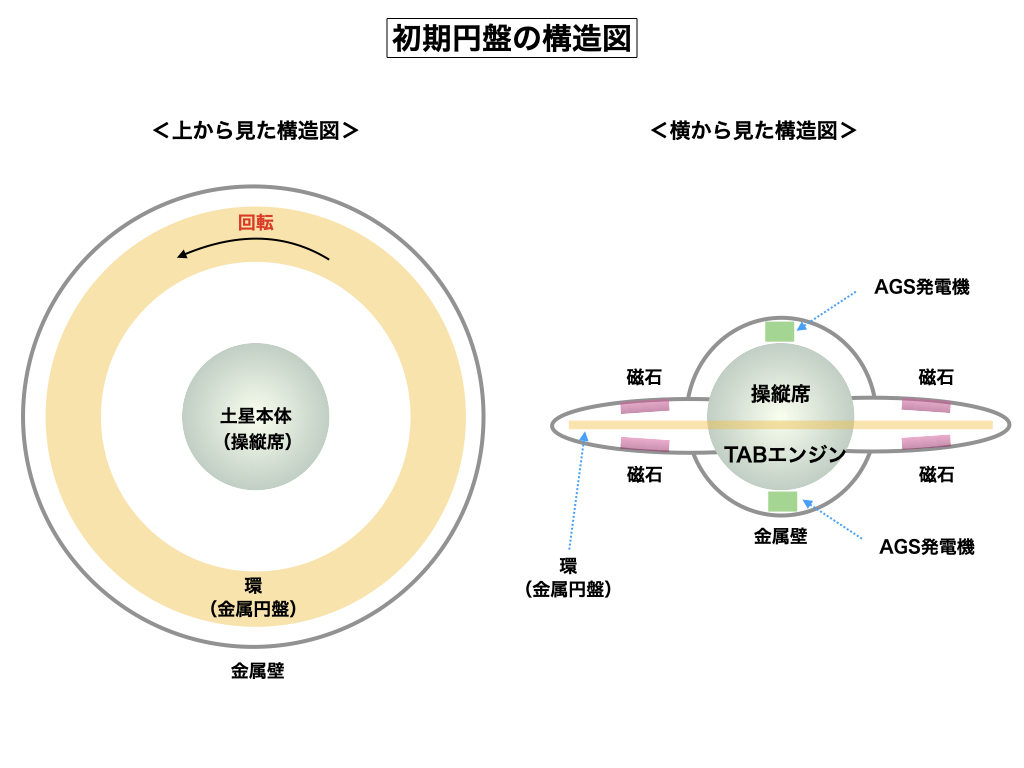 円盤の概略構造は土星を真上から眺めた形状であり、中心部の土星本体(操縦席)は不動であるが、土星の周囲の「環」だけが回転するシステムだと言えば分かり易いと思います。操縦席は球体の北半球側にあって、TABエンジンは南半球に設置され、また赤道の回転翼は薄い金属円盤で構成されており、まるで土星とその環を金属壁で包み込んだ形状の宇宙船と言えます。回転翼(環)は磁石の反発力で浮いており、それを回転させる動力は、円盤そのものがAGS発電機(astro-generator system)であって、天体磁場から直接電力を生み出す万年電池を呈しています。回転翼の回転によって反重力性が生じ、円盤は宙に浮きますが(力学的な渦骨格が形成される)、逆に円盤内部には磁場重力が作用して、人間は船内で立てる事になります。また推進力そのものは本体の南半球にあって、直径が約2mのTABエンジンが取り付けられています。非常に簡単な構造とはいえ、地球人が知らないAGS発電法や、反重力機能や、TAB推進法が盛り込まれており、これらが揃わないと宇宙航海は出来ません。