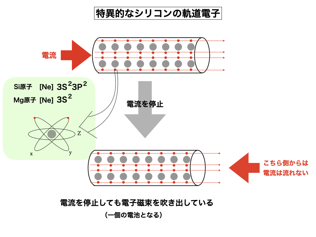 しかし、原理が分からないままに応用した技術と、原理を理解した上で応用する技術は桁違いであり、前者は「横の進化」しか出来ませんが、後者には「横の進化」のみならず「縦の進化」が加わります。そもそも、地球人類は四角い「シリコン・ウェハー」に電流を流しただけなのに、なぜそれが記憶装置になるのか、連中は意味も分からないままに「行き当たりバッタリ」で作っているのです。半導体を扱う地球人の理論ベースが「電流のホール移動理論」と量子力学の「バンド理論」から成り立っており、この理論自体が真っ赤な嘘である理由から、原理がさっぱり分からないまま、試行錯誤の繰り返しで研究開発が進められてきました。これらの理論など、実験結果を受けて後からなすりつけた「こじ付け理論」であって、技術者達の創意工夫で半導体技術を進展させてきた経緯があります。棒状の純度の高いシリコン(Si)結晶に片方から直流電流を流してやると、シリコン原子の最外殻の電子軌道(3p2)の2個の電子が極性を揃えて配列し、加えた外部電流(電子磁束)を外へ伝えます。問題はシリコンの半導体特性であり、電流を切っても一度配列した電子の形状がそのまま維持されるという事です。