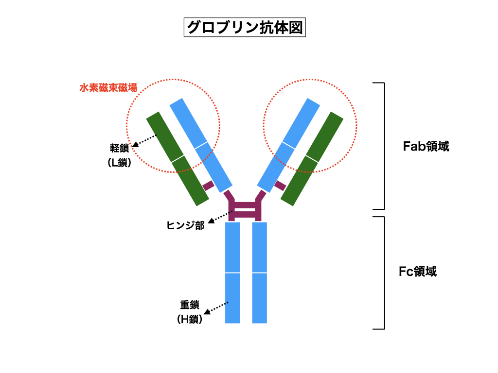 免疫グロブリンは重鎖のボリペプチド構造を呈しており、Yの字型に開いたFab領域のH鎖から水素磁束が放出され、その磁束が反対側のH鎖に吸収されるという磁場を有しており、その力で抗原を吸着するという能力を有しています。また、Yの字の下の部分(Fc領域)には発信器を備えており、抗原を捕獲すると信号音が発信される仕組みです。使用済のグロブリンはFab領域に磁性を有する理由から(無垢のグロブリンには磁性は無い)非常に結合し易く、大量に存在する場合は互いに吸着し合って団子状態となり、血栓の元を作ってしまいます。使用済グロブリンはそうした危険物である為に、人体にはグロブリンの癒着結合を阻止する対抗手段があります(血中蛋白質極性抑制ホルモン=グロブリン乖離ホルモン)。それでも蛋白質分解酵素(ペプシン)によってグロブリンが分解さると、Fab領域とFc領域に分解されたグロブリンは、Yの字(Fab領域)の側鎖同士が吸着し合って、それが互いに重合して「βシート化(不溶性アミロイドの生産)」していく事になります。そのアミロイドが心臓や心筋に沈着して悪さを働くのです。これらは徒らに使用済み抗体を増やした結果、出現してくる病気(副反応)なのです。無論、グロブリンのβシート化を防止するホルモン(脳下垂体前葉)も存在しますが、その分泌量が少ない体質の方はワクチンの副反応が命取りとなります。