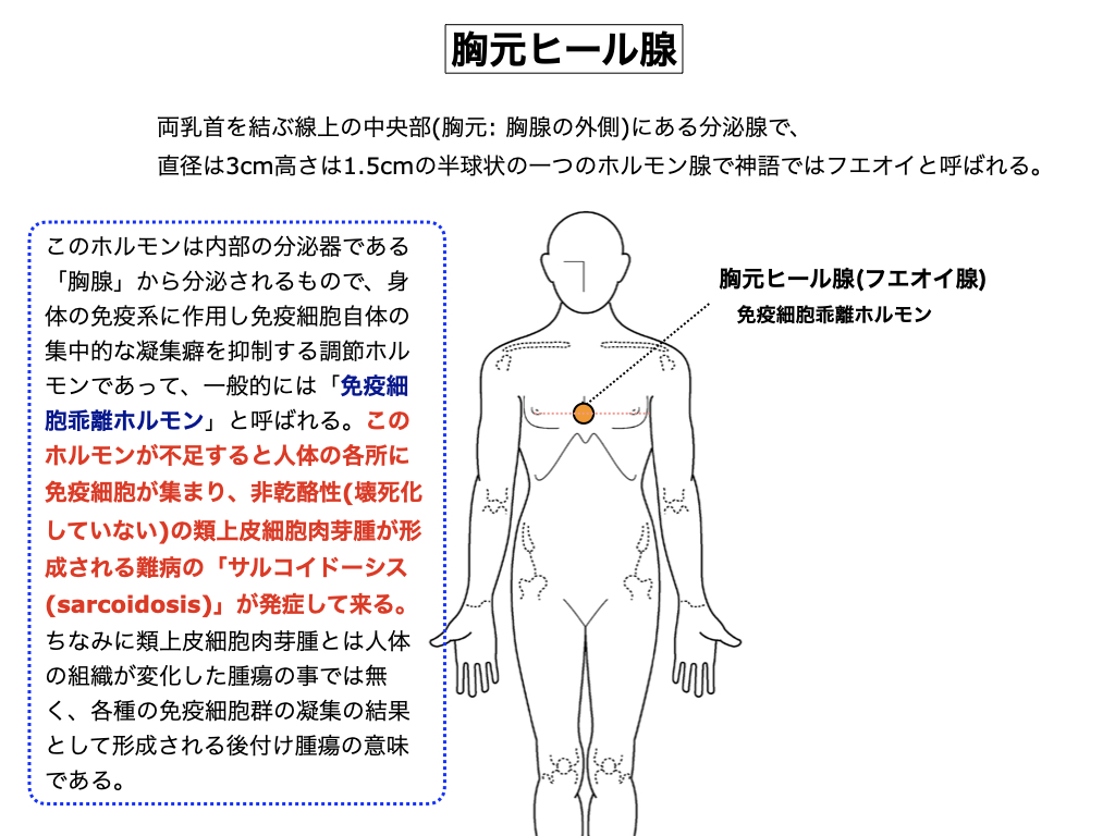 地球医学は物質医学の領域から未だに出ておらず、電気や磁気や力気といった、目に見えない物理系の学問が未熟である理由から、アストラル物質で構成される人体組織に関しては全くの素人、体の7割にも及ぶ人体アストラルの医学知識を何も持っておりません。今更、その現実はどうにもなりませんが、人体には目に見えない器官や組織が一杯ある事を知って頂きたいと思います。1人の人間の身体全体も、また1個の体細胞も電磁気の衣で包まれており、またその上から力学系のヒール(力気で構成される遺伝子)が取り巻いているのが人体の基本構造です。ホルモン腺という内分泌器官を取ってみても、物質ホルモンは存在しますが、ヒール・ホルモンと呼ばれる物理系のアストラル・ホルモンも同時に存在しており、サルコイドーシスという特殊な病気はこのヒール・ホルモンの分泌不足から発症してくる病気なのです。乳首と乳首を結ぶ線の真ん中(胸の中央部)には「胸元ヒール腺(フエオイ腺)」と呼ばれるヒール・ホルモン腺が存在するのですが、このホルモン腺に物理的な異常が発生した場合、フエオイ・ホルモンの分泌量が不足して病状が現れてきます。このホルモンの地球名称は「免疫細胞乖離ホルモン」と訳されており、我々はこのホルモン腺を修理してサルコイドーシス患者に対応しております。