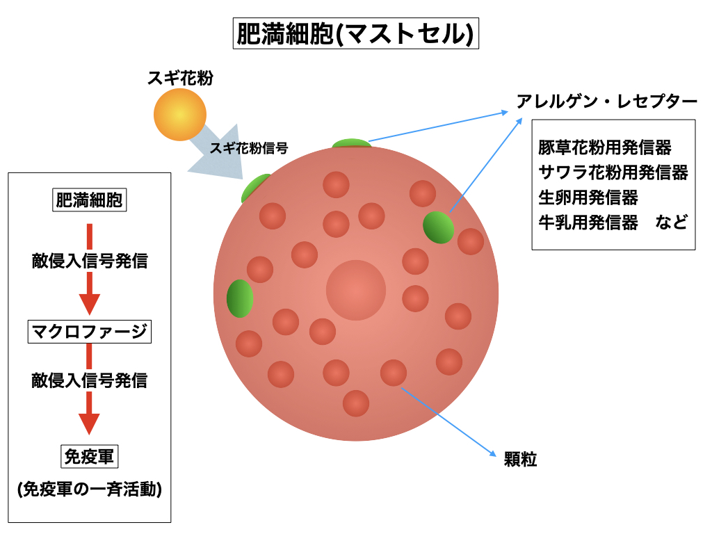 肥満細胞はヒールが判断した指令を下位の免疫軍へ伝える機能を有しており、体の内部に伝達する為の「力学発信器」を有しています。「物質信号」という手段で細胞同士は普段互いに連絡を取り合っています。通常の病原体(ウイルスや細菌)の場合はマニュアル通りの発信器(T細胞伝達)を使用しますが、規模や物量に応じては体の免疫中枢部(マクロファージ)へ直接伝達しなければならず、その為の特別な発信器を作り出します。肥満細胞は自らの細胞膜の外に直通発信器を作り出すのですが、それがまるでキノコの様に見える事から、我々は肥満細胞の「耳」と称しています。実はこれ、ヒールが誤認識した「アレルゲン(抗原)・レセプター」であり、認識した種類の数だけキノコが生えているのです。つまり、「豚草花粉用発信器」、「サワラ花粉用発信器」、「生卵用発信器」、「牛乳用発信器」とか、ヒールが認知した分の「耳」が形成されている訳です。例えば、生卵アレルギーの方が生卵を食すると、「生卵レセプター」が突然鳴り出して、体内の血管にいるマクロファージがその信号を受け取って、今度はマクロファージから全体の免疫軍に対して出動命令が伝えられて、免疫軍全体が一斉に色めき、活動を始めてしまうのです。生卵は普通に食道を経て消化されるだけの話ですが、戦闘すべき相手の姿も見えないのに、ただ免疫軍だけが「敵は何処だ」と騒いでいるだけの話なのです。