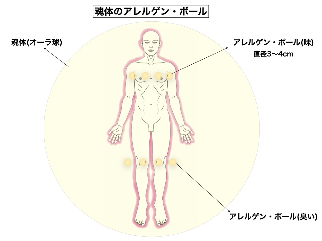 「マジか?」と疑っている方もきっと居る事でしょう。勿論「マジ」な話ですので、一度試してみる事でしょうか。魂体のアレルゲン・ボールには2種類のものがあって、足膝の周辺に形成されるのが臭い分子に対するものですが、胸の辺りに形成されるのが「味」に関するものです。ネギが大嫌いな子供には「ネギ・アレルゲン・ボール」なるものが形成されていて、ネギが食べらないと文句を垂れてくるので、お母様が子供の魂体のネギ・ボールを潰してやれば突然食べられる様になるという、嘘みたいな話なのです。逆にこうした「嫌いボール」の種類を特定して、その方の嫌いな食べ物を割り出す事も出来ます。とにかく、理性コントロールも難しいぐらい臭いと味には敏感でウルサイのが魂体の特徴でしょうか。
