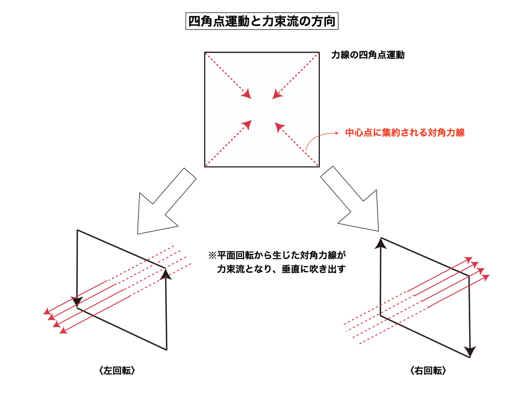 渦巻原理は皆様にも分かると思いますが、渦巻の平面を見て左回転の場合は手前側に磁束が噴き出て、右回転の場合は反対側に磁束が噴き出ています。磁束が噴き出る方向がN極、吹き出した磁束が吸収される方向がS極となります。この渦運動を形成する母源運動がいわゆる「力線の四角点運動(回転運動)」なのですが、この力線運動にも規則性が存在しており、いずれも「エネルギー保存則(角運動保存則)」に基づく規則性です。出発原点である直進運動の命は短く、たとえ力線であろうと回転しなければ「力の維持」は困難です。回転運動の妙技とは「循環」に在って、力線の循環を図ってロスを補い、少しでも長く生きながらえようするのがエネルギーの本能だと言えましょう。皆様は生命論講座の初級編を学んで、天体や粒子が渦磁場を形成しており、その力学的な骨格が正八面体形状(Wピラミッド構造)の「テトラ体」である事を学習しました。つまり、力場骨格を具体的なイメージ像として正確に捉えられた訳ですから、問題はそれから先の柔軟な応用力でしょうか。