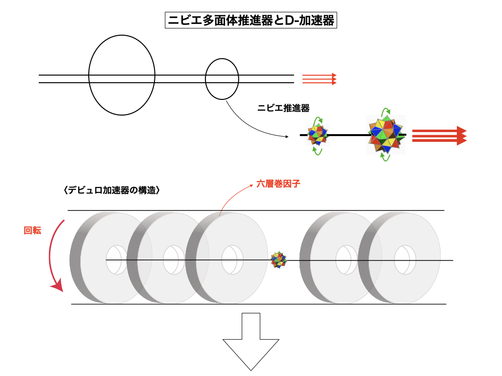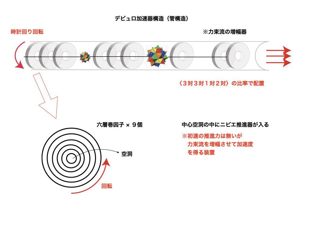 プレアデス時代の後半には、アリニラム軍が桁違いの速度性能を誇る「ニビエ多面体推進器」を常備した戦艦を繰り出してきますが、一本軸で形成される多面体を回転させる事によって「力束流」を一本化し、それを更に増幅させて吐き出すという1ランク上の推進器です(炭酸ガス推進器の500倍速い)。これは創造主の第四技術伝授による物ですが、こうした創造主の伝授マニュアルには掲載されていない独自の加速器(D-tube: デビュロ位相差推進術)を編み出したのがベテルギウス民族です。このデビュロ加速器とは6層構造の回転板を9列並べた直管構造をしており、今から4万年前のベテルギウス軍はニビエ推進器をデビュロ管の中に配置して、更に100倍の速度まで出していました。デビュロ加速器を装備したニビエ円盤は昔のプレアデス艦の約5万倍の速さを誇っていました。