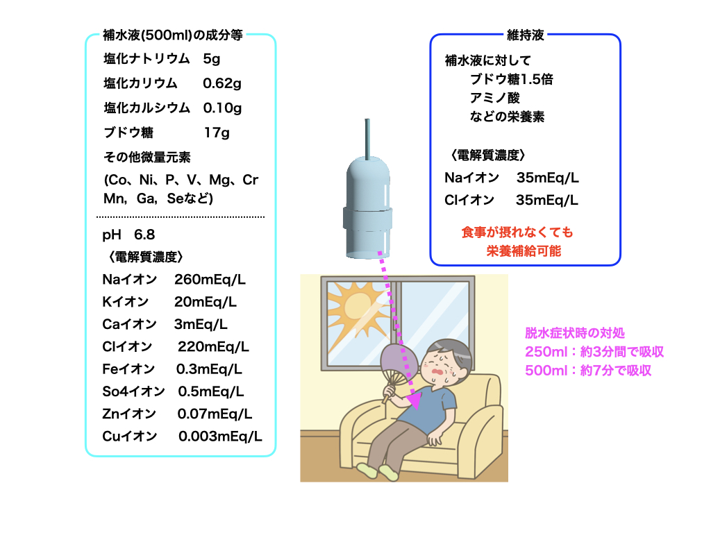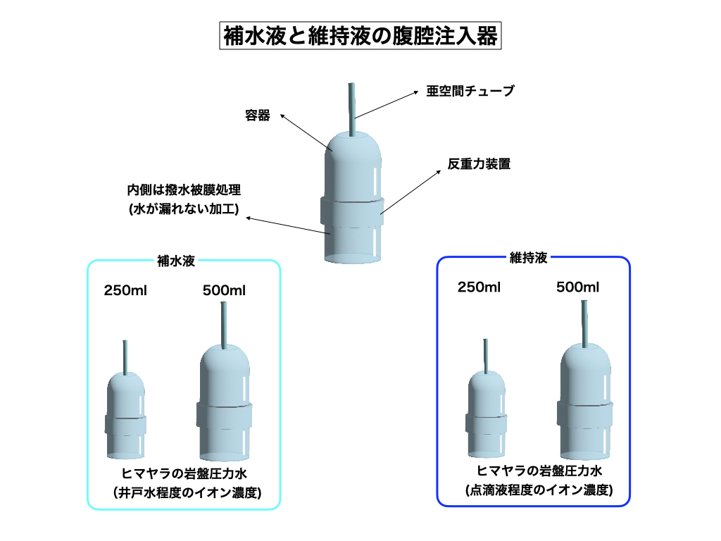 岩盤圧力水とは山脈の地下水源で強烈な圧力を付加されている「超臨界水」の事です。メキシコの「トラコテの水」や、アルプスの「ルルドの水」などでお馴染みの「奇跡の水」と謳われている物です。超臨界水はそのままでは使えませんが、汲み上げて通常水へ変化すると、非常に作用力の高い水へと変貌します。我々が利用している水はヒマヤラ山脈の地下6kmの岩盤の中に存在する水であり、250mlでは約3分間、500mlでは約7分間で血管に吸収されてしまいます。点滴よりも吸収率が遥かに早く即効的なので大変重宝しており、無論、内部のイオン濃度は調節していて、補水液は井戸水程度、維持液は点滴液程度に補正しています。バリバリの若者でも、夏場は海や山で脱水症状を呈する方が多いのですが、時と場所を選ばずに即座に「命の水」を供給出来る様になって、宇宙医学の緊急救命は大きな一歩を踏み出したと言えます。
