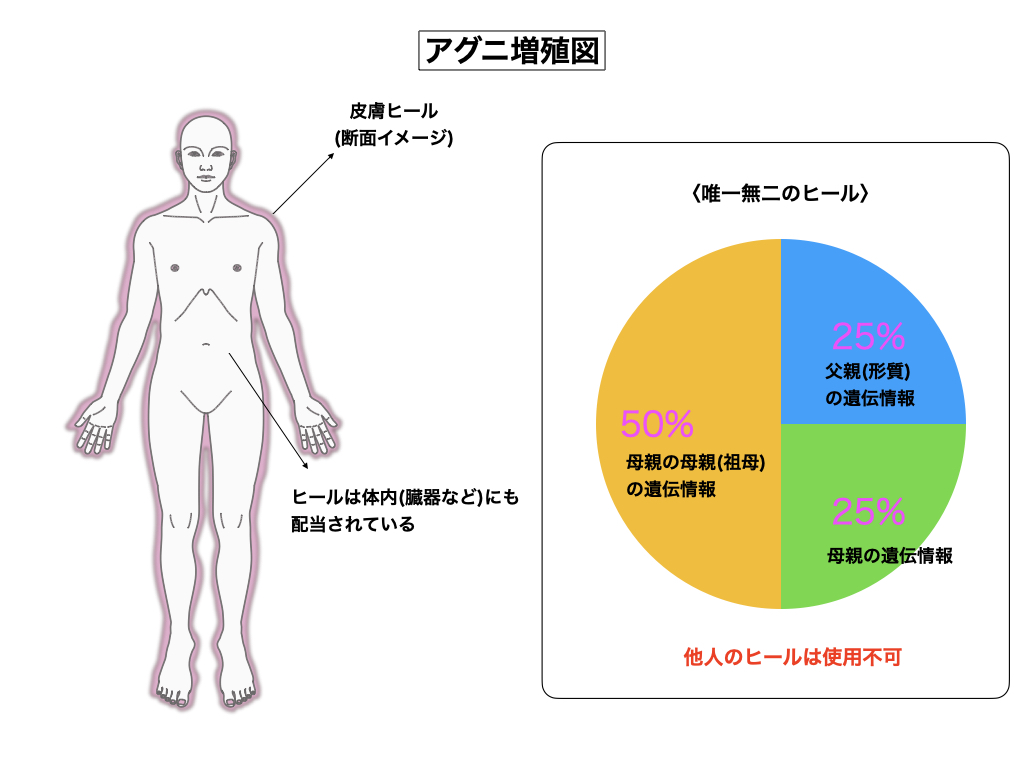 自己ヒールの出発点は精子と卵子が受精する(ヒール融合)瞬間から始まりますが、ヒールは代々母系遺伝情報が基盤であって、受精卵が有する遺伝情報の配分比率は、本人の獲得情報(50%)の内訳は母親(25%)と父親(25%)のヒール情報となりますが、では残りの50%の遺伝情報は誰から引き継いだものかと言えば、それは母親の母親、つまり祖母側から引き継いだ遺伝情報となります。これは一体どういう仕組みなのかと言えば、本人にとって父親の形質は25%(1/4)に過ぎず、残りの75%(3/4)は代々の母系側の遺伝情報から成り立っているという意味に他ならなく、そんな唯一無二のヒールだから、本人に他人のヒールを混ぜ込んでも、ヒール自体が他ヒールを「異物」として認知して機能しなくなってしまうのです。ヒール(遺伝子)は本人以外の物しか受け付けない純粋無欠な存在物だと言えましょう。メンデルの「遺伝の諸法則」の根幹にはこのヒール法則が関係しており、DNA(核酸)を遺伝子であると考えている現代医学はとんでもない勘違いを犯している事になります。まあ、ヒールも目では確認出来ないアストラル物質故に、仕方が無いと言えば仕方が無い話ですが、臓器ヒールが細胞の「分化」に関わっている事実を理解するのに、一体どれ程の歳月が掛かるのかと考えれば、ゲルマン似非医学など構わないで放っておこうかと思ったりもしています。
