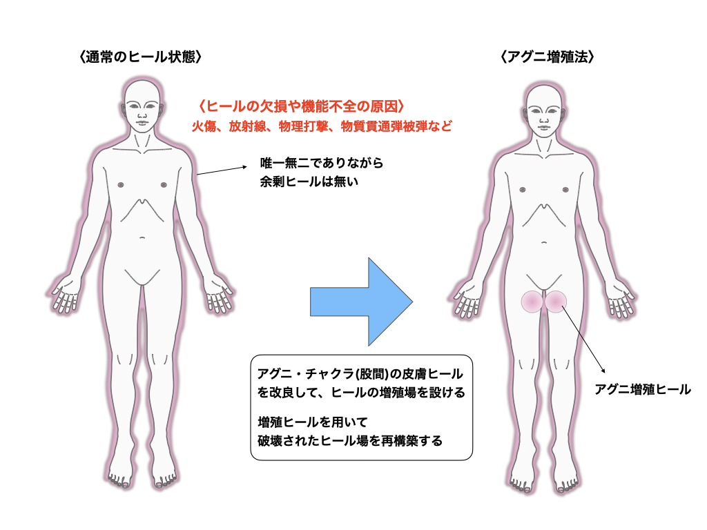 宇宙医療団は「ヒール遺伝子」を操作し、再生治療(遺伝子治療)を施せる所が優れた特徴なのですが、残念ながら「ヒール」とは個人固有の遺伝情報物であり、失ったヒールを他人から供給してやる事が物理的に出来ません。医療団はヒールを操作出来るものの、ヒールを増殖させられなかった理由から、遺伝治療には限界がありました。自己ヒールを一体どうやって増殖させるのか、その手法を開発するのに随分時間を要しましたが、今から5年ぐらい前に「ヒールのアグニ増殖法」を開発し、以来、遺伝治療を施す事が可能と成って、それまで不可能とされてきた遺伝子病と戦える事に成りました。ちなみに、「アグニ増殖法」とは「アグニ・チャクラ(股間)」の皮膚ヒールを改良して、ヒールの増殖場を設ける手法であり、その増殖した余剰ヒールを欠損部に宛てがって、破壊されたヒール場を再構築するというものです。特に臓器ヒールの欠損部やダメージを受けた欠陥部、あるいは各種のヒール・ホルモンの欠損部などの治療に使われています。ヒールは火傷や放射線や物理打撃や物質貫通弾などによって、傷付いたり機能を失ったり欠損したりする摩耗品だからです。