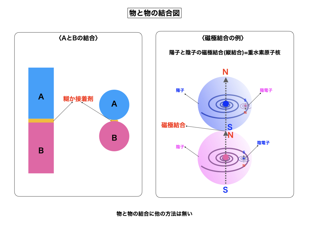 また、物体同士が結合したり化合したりする理由は、たとえ粒子であっても物体引力(ファンデルワールス引力)で互いに引き合っているケースは一つも無く、物と物を結合させる為には「糊(のり)」か「接着剤」が必ず必要となります。唯一、接着剤を必要としない場合は、原子や素粒子が磁石的な「極極」を有している場合のみに限られており、これは宇宙法理であって例外はありません。更に言わせてもらえば、粒子が粒子を介して「共有結合」するという概念も間違っており、この宇宙には「電子の共有結合」という現象も存在しないし、また、グルーオンや中間子などの「接合子」を媒介にして粒子結合が起こるという現象も存在しません。これらは地球科学の致命的な「過ち」であって、原子や分子同士の化学結合も含めて、粒子同士は全て「磁極結合」で行われています。地球の核物理学では、粒子に作用する力の種類を、「重力作用」、「電磁的相互作用」、「強い相互作用」、「弱い相互作用」といった4種類に分類している事は聞いた事があると思いますが、皆様はこの曖昧な言葉に違和感を感じた事は無いでしょうか。実はまだ彼等は粒子の成り立ち構造など何も知っておらず、原子核の内部の事すらも、つまり陽子と中性子の関係すらも皆無に知らないのです。