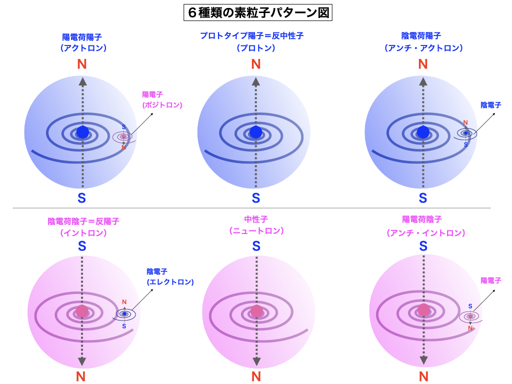下記に示したのは2種類の核子(陽子と陰子)と2種類の電子(陰電子と陽電子)という四つの基礎素粒子が互いに織り成す変化パターン(6種類)です。核子も電子も渦巻であり、左巻き(反時計回り)に回転するのが陽子と陰電子、右巻き(時計回り)に回転するのが陰子と陽電子です。核子は親渦であり、一方、電子は子渦である為に、惑星と衛星の関係の様に、惑星は衛星を捕獲したり、また放出したりする事が出来ます。基本形は陽子と陰子の組み合わせが普通の状態なのですが、核子は都合次第で内在電子を外に吐き出す場合もあって、逆に電子を自己の系内へ呼び戻す場合もあります。それと、これは滅多に起こる現象ではありませんが、加速器や原子炉の中では陽子が陰電子を捕獲したり、陰子が陽電子を吸収したりする事があって、異なる電荷を示す場合があります。ちなみに、宇宙物理では核子(陰陽)が呈する電荷を「磁荷」と呼び、電子(陰陽)が呈する電荷をそのまま電荷と称しております。従って、一般的な陽子とは、その系内に陽電子を抱えており、我々は「アクトロン」と称していますが、アクトロンは陽磁荷+陽電荷を示す事になります。