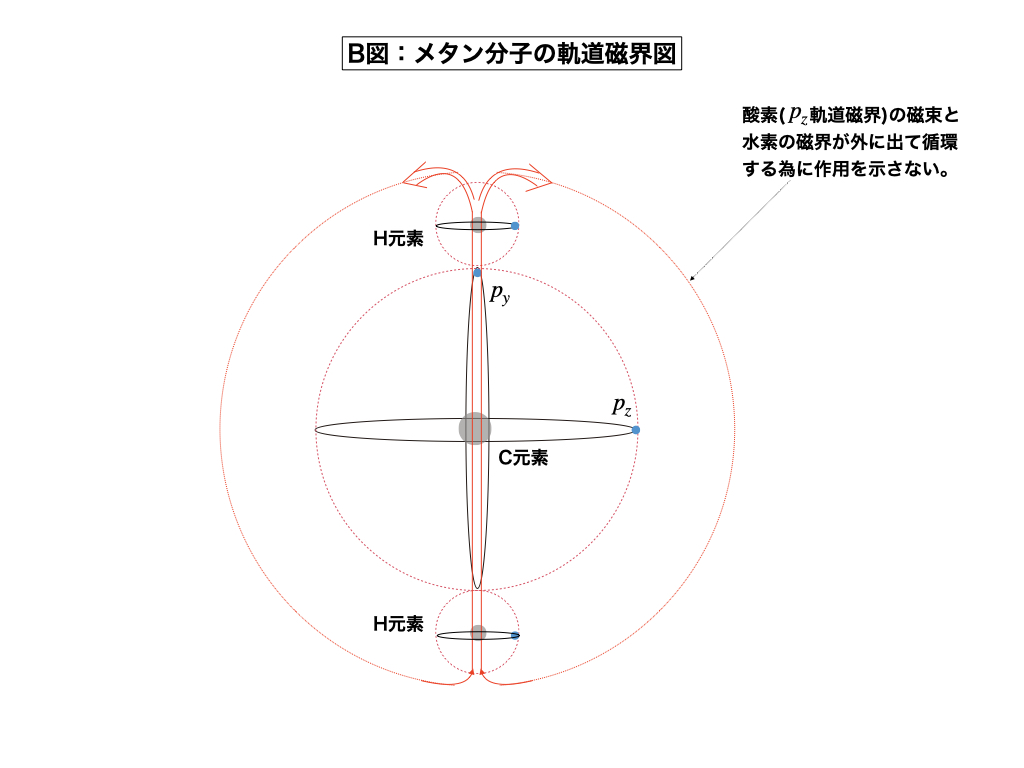 下記に示したのが、水分子の軌道磁界図とメタン分子の軌道磁界図であり、酸素原子と水素原子が、あるいは炭素原子と水素原子がどの様に磁極結合を起こしているのか、そしてそれぞれの磁束がどの様に動いているのか、それを見比べたものです。化学式を見ただけでも具合が悪くなる人も多いのに、その化学結合を引き起こす電子軌道磁界の構造分析まで突き詰める話には「吐き気」をもよおす方も居るだろうと推察しますが、この部分をしっかり理解して納得してもらわないと宇宙生命論の有機化学を学んだ事にはなりません。最初のA図(水分子)ですが、酸素原子のPxとPy軌道電子(襷型)が描き出す軌道磁界のN極と、水素原子の1s軌道磁界のS極が結合して、その磁束がN極から外界へ放たれていますが、この状態は磁石棒が普通に存在する状況と一緒であり、磁石はいつでも結合できる状態にあります(余力を残している)。しかし、B図(メタン分子)の場合は炭素原子のPxとPy軌道電子(十字型)が描き出す軌道磁界の両極には、それぞれ2個の水素原子を捕獲している理由から、水素原子のN極から噴き出した磁束は反対側の水素原子のS極に吸収されて循環するという閉塞場を呈している事が大きな違いとなります。