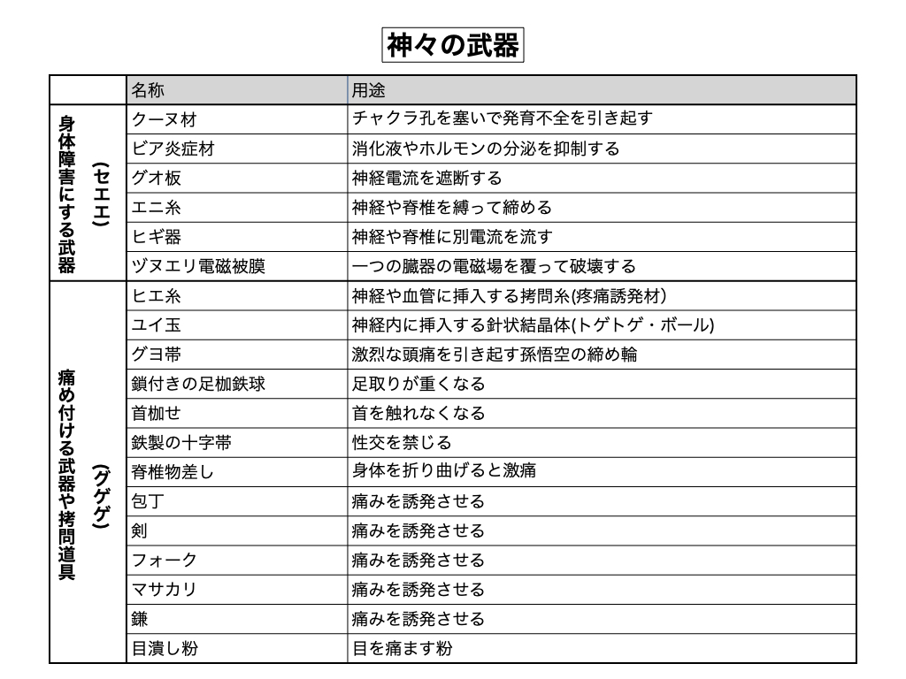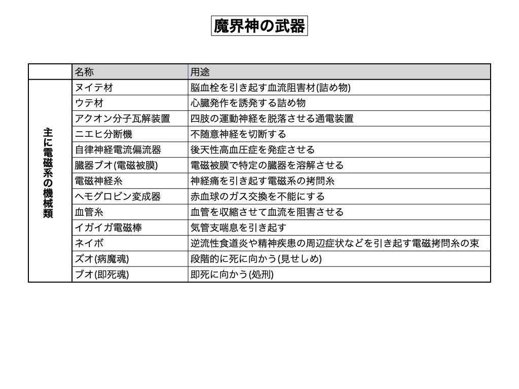 ※ 小脳及び脳幹から脊髄にかけて多系統に渡る変性萎縮病で神経細胞が徐々に破壊されて消失して行く運動失調病である。現代医学では常染色体の異常では無いかと見積もられているが(遺伝病)、先天性ばかりでは無く後天的にも発症するので原因は良く分かっていない。発症部位の違いで複数の種型(36型)があるが、現在病名は一本化されている。実は小脳変性症(CCA)も多系統萎縮症(MSA)も遺伝病とは全く無関係であり、いずれも「天罰病」であって神々(魔界神では無い)が罪を犯した人間に仕掛ける病である。当然、天罰病を治そうとすれば、その医者も天罰を受ける対象となる。神界のセエエ武器の中に脳神経の中に微弱な電流を流す「ヒギ器」と呼ばれる天罰武器があり、それを小脳や脳幹や脊髄の中に神々が仕掛けている。あるいは「エニ糸」と呼ばれる神経や脊髄を縛る糸で組織を締め上げる場合もある。これらの武器を仕込まれると脳内のグリア細胞内部に特殊な封入体(GCI)が形成されるのが特徴であるが、「ヒギ器」は基本的にその人間をこの世から抹殺するのが目的では無く、学んで成長する意欲が全く無い者(頭を使った深い思考をしない者)から運動能力を奪って軽薄で安易な行動を取らせないに拘束するのが本来の目的である。武器を外すと病気の進行は止まるが、長い期間に渡って挿入された場合は「廃人」に近づく。下記は神々武器や魔界武器の一覧表である。