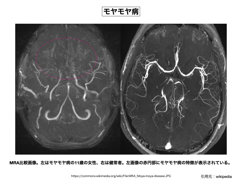 ※ 脳底部に異常血管網が見られる脳血管障害の事で、特に大脳動脈輪の主幹動脈(中大脳動脈近位部: 内頸動脈終末部)の閉塞や狭窄によって代償的に形成された側副血行路の未熟な血管網(モヤモヤ血管)の事を指している。早い話が、ウイリス動脈輪の血管内部で閉塞や狭窄が発生するから、それを補う為に細くて未熟な代替え血管網が発達し、その血管網が様々な脳障害を発生させている。なぜ、特殊な脳領域に血管の詰まりが発生するのか、その原因は良く分かっていないが、家族単位で発生する事例も多く、その様な意味で遺伝病の一種とみなされている。実はこの病気も神々(魔界神)が引き起こす病気の一つで、ウィリス動脈輪の内頸動脈終末部に魔界武器の一種である「ヌイテ材」を詰めて動脈閉塞を発症させるのがその目的である。「ヌイテ材」とは脳血栓を引き起こすアストラルの詰め物であり、また「ウテ材」とは心臓の冠状動脈に仕込む詰め物であって、両者は典型的な魔界武器であり、基本的には肉体の命を狙う物である。魔界関係者がいる家族の身内に良く発生し、また魔界契約時にも武器を挿入されるケースも多い。挿入された魔界武器を外しても、症状の緩和は見られるが、一度形成されてしまった未熟な側副血行路は除去する事が出来ない。