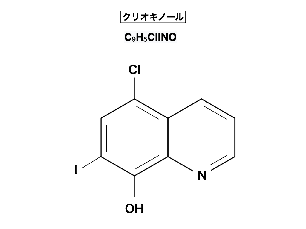 ※ スモン病訴訟で有名な話であるが、1955年頃から風土病と考えられる奇病が北海道(釧路)や埼玉県(戸田)で発生し、10年後にはその病気はピークを迎えた。風土病の原因に関してはウイルス説が囁かれたが、その病気(下痢症状)の整腸剤として販売された田辺製薬の薬(キノホルム)の方が、神経疾患(下肢の痺れや脱力や歩行困難)などの副作用が重要視されて訴訟問題へと進展した。実際の風土病よりも深刻な薬害被害だったからである。販売を中止したら病気は治って新たな患者発生は無くなった。下記は薬害となったキノホルム(クリオキノール)の分子構造式である。