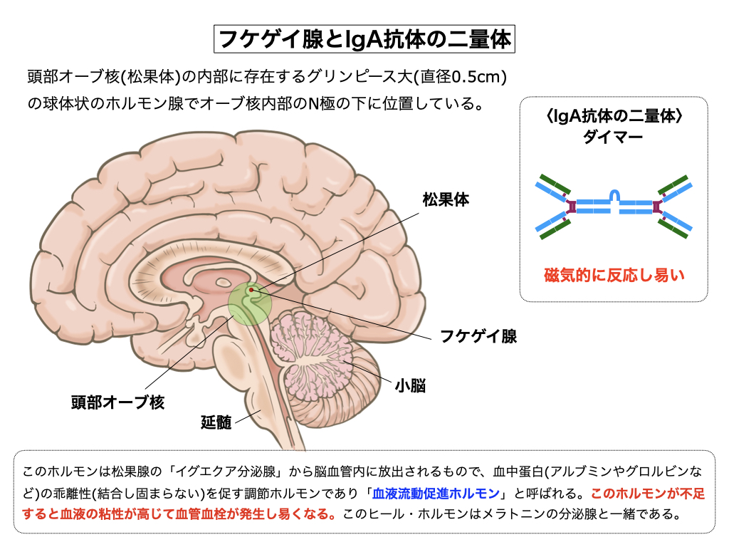 ※ IgA腎症とは腎臓の糸球体に免疫グロブリンのIgA抗体が沈着して腎臓の血液濾過作用を阻害し徐々に弱めて行くと言う病気である。IgA抗体分子はもともと二量体(ダイマー)を呈する構造であり、これは磁気的に反応し易いグロビンA種である事から、身体の機能としてもグロブリン癒着が起こらない様な防御システムが存在している。無論、地球医学では知られていないが、宇宙医学では当たり前の知識である。大脳中心部に存在する松果腺からは「メラトニン」と言う睡眠に関係するホルモンが分泌されているが、これと同じ位置にヒール・ホルモンの一つである「フケゲイ腺」が存在する。ここから分泌されているホルモンが所謂「血液流動促進ホルモン」である。このホルモンは血中の大型蛋白(アルブミンやグロブリンなど)の乖離性を促す役割を果たしている。今回は64名のIgA腎症患者を調査させてもらったが、その結果、全員がこのホルモンが30%以上の減退を招いている事実が判明した。ヒール・ホルモンなので人工的に合成する事は出来ないが、ホルモン腺その物を再築させる技術は宇宙医学にはある(ヒールのアグニ増殖)。