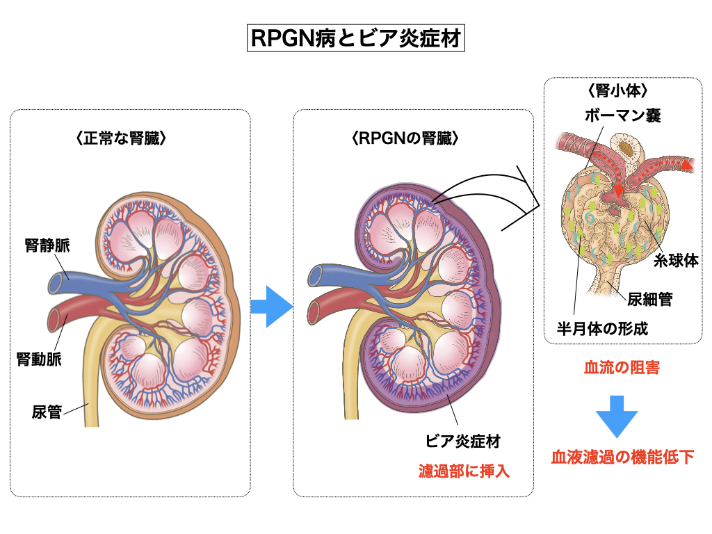 ※ 腎臓の糸球体に急速かつ激烈な炎症が生じ、数週間から数ヶ月の経過で腎機能が急激に低下して腎不全に至る病気である。重篤な糸球体腎炎症候群であり、予後が大変悪く、透析へ移行しない場合も、慢性腎不全として継続的な治療が必要となる。この病気に特徴的なのはボウマン腔に形成される「半月体(クレッセント)」と呼ばれる構造の出現である。この半月体構造が血流を阻害し糸球体における血液濾過を急速に低下せしめて腎機能が悪化する。半月体は免疫複合体の沈着によるもので形成の原因は不明である。実はRPGNとは神々の「天罰病」であって(魔界天罰とは異なる)、両方の腎臓の濾過部に神々武器である「ビア炎症材」を挿入されて発症する病気である。性能の良いレントゲンを使用すれば「ビア炎症材」の形状がボンヤリと映し出されている場合がある。神界の天罰基準によれば、この刑罰に処せられる人間達とは「神仏に対して無信心かつ背神的で畏敬の念も感謝の念も抱かない人」と規定されている。まあ今世は人間としては失格なので、本人が改心するまでずっと病院に居てもらうと言う病気である。血液が電磁場に直接触れて固まってしまうのが半月体の形成要因であり、こんな天罰病を研究した所で、そこから学べるものは何も無い。