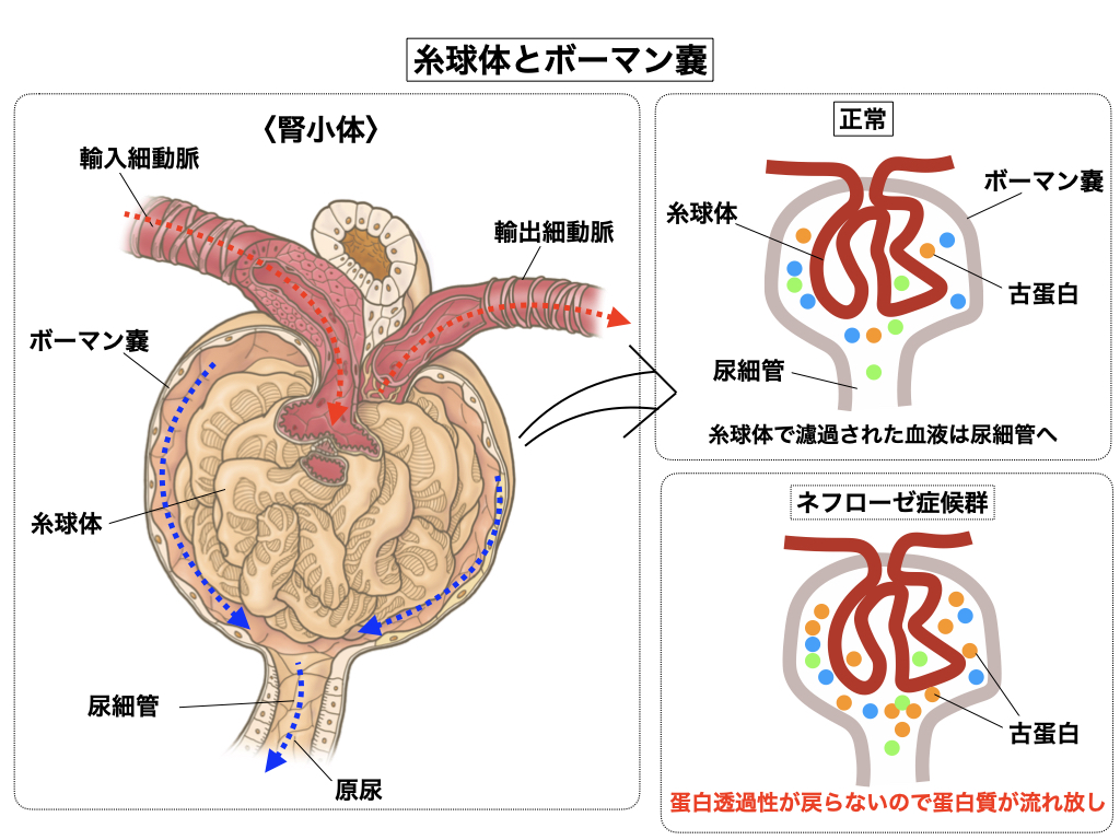 ※ ネフローゼ症候群とは著しい「蛋白尿」による低蛋白血症の結果、血管外へ水分が浸透して体に浮腫が出現する代表的な腎疾患の事であるが、ウイルス性などの場合は自然に治癒したり、または病院治療でも良くなるケースが多い。しかし、一次性や二次性を問わず、蛋白尿が軽減せず浮腫が出没して末期腎不全に至る場合も少なく無い。この様な病態を「難治性ネフローゼ症候群」と称している。炎症も無く沈着物も無いのに、なぜか腎小体における糸球体基底膜や蛸足細胞の蛋白透過性が異常に亢進されて、高い蛋白尿が観察されるのがネフローゼ症候群の特徴である。そもそも地球医学は腎臓に関してどれ程の知識を持っているのだろうか。宇宙医学によれば、腎臓の機能は大きく四つあって、下腎コリン電線領域は「血液濾過機能」と「血中PH値の定常化機能」、上腎コリン電線領域は「血液濾過機能」と「古蛋白処理機能」と「腎臓アミロイド蛋白合成機能」である。肝臓で生産される「アルブミン」や「グロブリン」や「フィブリン」などの大型の血漿蛋白質には賞味期限が存在し、3年間隔ぐらいで新品の物と定期的に交換されている。それらの古蛋白を処理している現場が腎臓なのである。濾過装置の上部には糸球体基底膜を意図的に薄くして古蛋白を尿中へ排出させる機能が備わっている。問題は、一度オープンにした蛋白透過性が元の状態に戻らないと、他の蛋白質までだだ流し状態になってしまう事である。