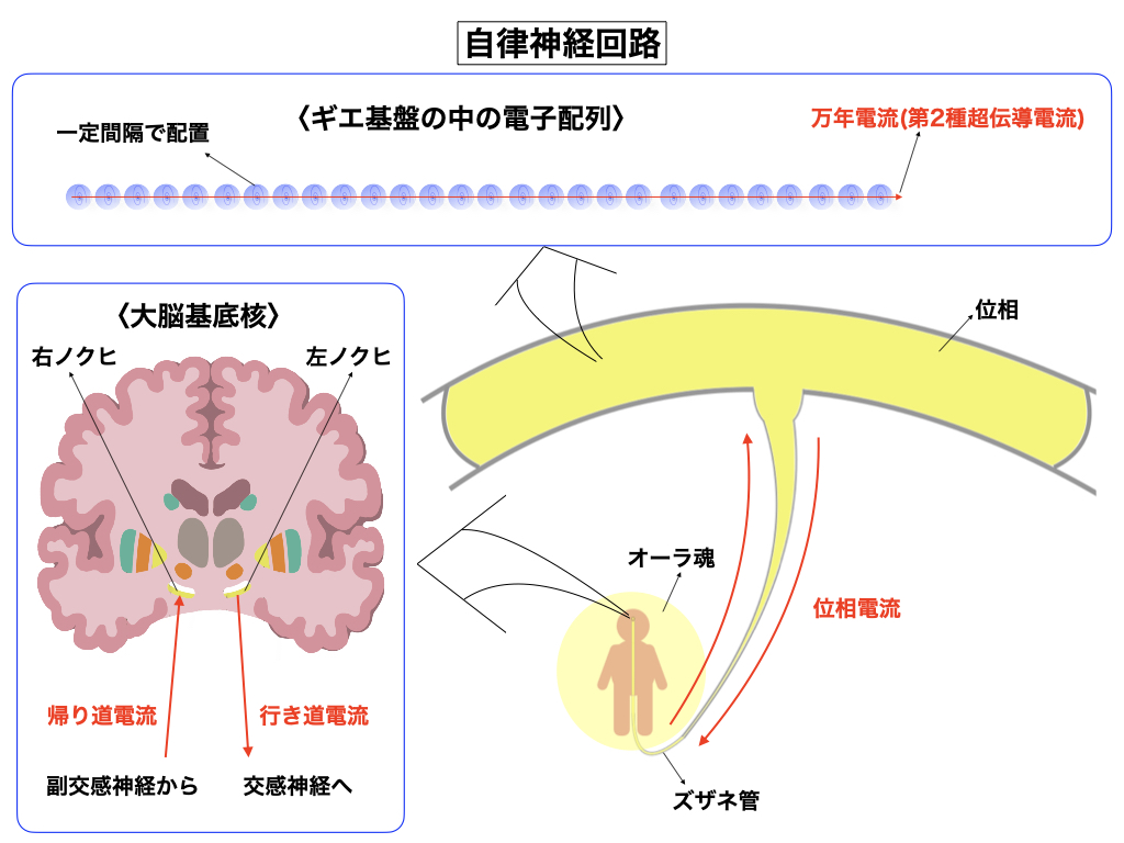 上図に示した自律神経回路を分析して見ましょう。位相やズザネ管の構成とはアストラル物質の「ギエ基盤」の中に電子を一定間隔で配列させた「万年電流(第2種超伝導電流)」を発生させる構造を呈しています。人間が「霊体」の期間はそれ自体が直流発電機である所の位相電流はズザネ管の先で折り返し、位相を介して循環運動を繰り返しています。そのズザネ管が人体へ入力接合されると、大脳基底核内部の「左ノクヒ(黒質網様部)」から電流が入力されて、自律神経電線を介して人体を一回りした後に「右ノクヒ」からズザネ管へ電流が戻って位相を循環すると言う電気回路が形成されます。勿論、左ノクヒ(黒質網様部)とは変圧器(減圧器)と変電器(電子電流をコリン電流へ切り替える装置)の役割を兼ねており、左ノクヒから下位の器官へと伝えられる電流は自律神経電流(交感神経電流: 行き道電流)として身体を駆け巡ります。交感神経電流として駆け巡った電流は帰路に着いて、今度は副交感神経電流(帰り道電流)として右ノクヒへ伝えられて、変電器(コリン電流から電子電流へ戻される)と変圧器(増幅器)を通ってスザネ管へと戻ります。