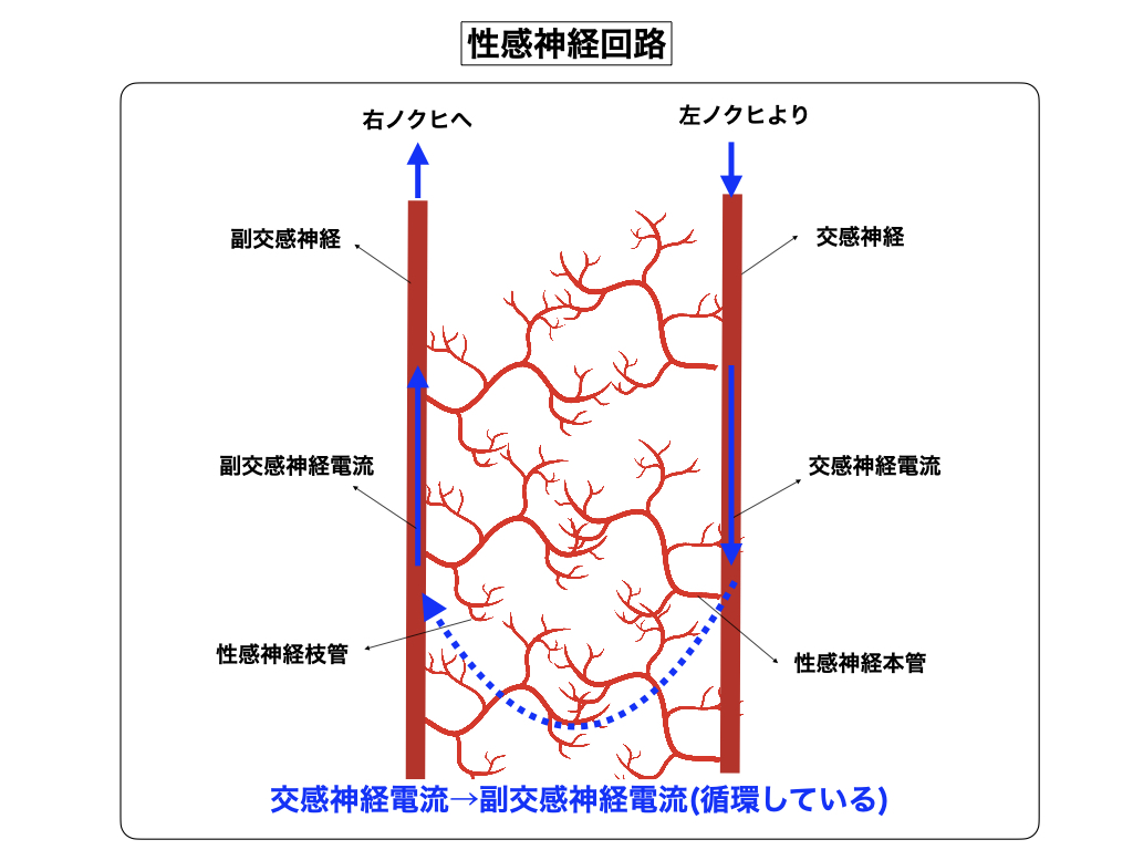 性感神経回路も性感覚神経回路も交感神経電流から分派して、結局は副交感神経電流へと戻っており、全体的に循環している事になります。さて、体の電気回路の説明はこれで終わりますが、身体の電流は炭素鎖を基盤とした「水素原子電流(コリン電流)」である事から、互いに強く抱きしめ合うとコリン電流が物理的な圧力で電流の流れが悪くなります(プロレスの裸締め状態)。互いに強く抱きしめ合ってはパッと解放し、またキツく抱きしめ合ってはバッと解放すると言った行為を何度も繰り返していると、性感回路の方からからバイアス電圧(印加電圧)が付加されて、右ノクヒの増幅器が異常興奮を示して大電圧をズサネ管へ流してしまいます。その大電圧が位相回路に至って位相内に「パラ電流(ショート電流)」が流れて気絶してしまいます。それが「位相オルガスムス」のメカニズムなのです。具体的な説明をすれば、男性対女性もしくは女性対女性でも構いませんが、地のオルガスムスを十分に味わった興奮状態で、性器に触れる事なく、接吻と乳房刺激を繰り返しながら、1時間に20回ぐらい強く抱きしめ合っていれば、やがて興奮が頂点に達して位相がショートに至り(全身性のショック)、3時間以上の気絶状態へと突入します。