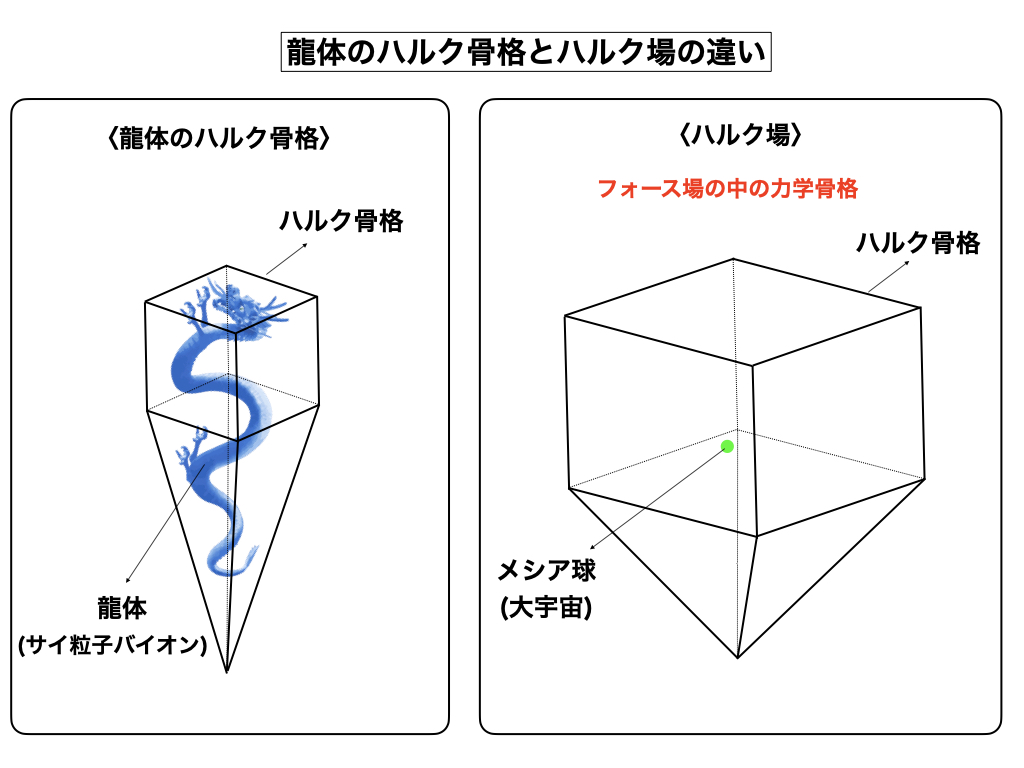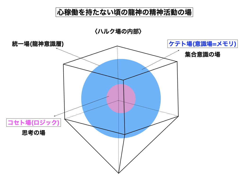 龍体は大宇宙壁を越えられない様に意図的に作っているが、特殊なバリアで龍体を保護すれば、大宇宙壁を越えて外空間にも進出ができるし、また龍神は大宇宙外でも自己の意識を失う事は無く、その飛翔能力を失う事も無い。実は最初期の龍神は高天原の創造主達(主にケエオア)がコントロールしており、もともと龍神には個の意識も無く、また個の心も備わっていなかった。高天原宇宙のハルク場内部で龍神の活動を操作していた事から、外宇宙のハルク場内部に龍神意識層が存在しているのである。そのハルク場の龍神意識層を「統一場」と称しており、統一場は内側の「コセト場(ロジック)」と外側の「ケテト場(意識場=メモリ)」に分かれている。いずれもハルク場の内部の話であるが、もともと龍神はケテト場で集合意識を囲い、コセト場で思考をしていた。ケテト場もコセト場もハルク・バイゾン層の事である。ヘランターニ(惑星白龍)の様に非常に癖が強いヘソ曲がりの龍神でも、大宇宙空間や大宇宙の外空間に出ると、えらく素直に従うので驚いたものだが、天体内部では個の心を発動させるから「ひねくれ龍神」に変貌するのだと確信するに至った。