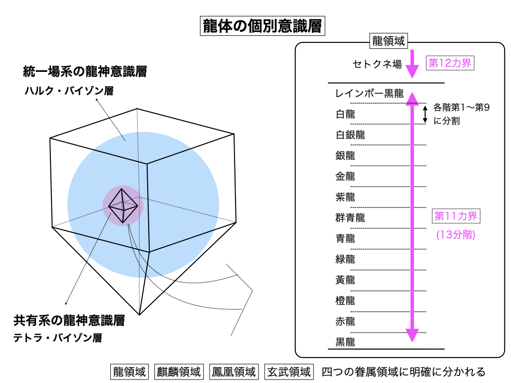 人間の場合は第7磁界に位相が存在したり、あるいは第3磁界に位相が存在したり、各人によってバラバラであるが、龍神にはズザネ管は無く、基本的に龍体と意識層は連結していない。無論、直結していなくても遠隔的に繋がっているのだが、龍神意識も渦磁場十二神意識も一緒であり、「12磁界の外周場(セトクネ場: 第12力界の内部)」に存在している。この意識層(セトクネ場)は龍神の全体意識の源であり、個々の龍神意識とは異なる。磁界の階層よりも力界の階層の方が一回り大きい為に、多少のズレがあるが、磁界で表現すれば、龍神の個々の意識は「第11磁界(第11力界)」に存在し、その第11磁界の12分階に存在している。意味が分かり難いかも知れないが、第11磁界(第11力界)そのものが12層から形成されており、一番上の12層が白龍層、その下の11層が白銀龍層、その下の10層が銀龍層と言う具合に、一番最後の黒龍層まで続いている。また白龍層の一つ上には(磁界別では第12磁界の範囲になる)、レインボー黒龍の意識層が存在している。