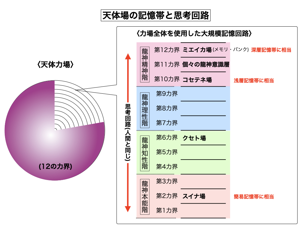 龍神は渦磁場の外に出ると、ハルク・バイゾン層で集合意識を囲い、また渦磁場内部ではテトラ・バイゾン層で個の意識を営んで、更に力場の心動帯を使って個の心を涌現(ゆげん)させている。従って、龍神魂のオーブ核はハルク力体用とテトラ力体用の両刀使いができる特殊な受信機が使われている。龍神の記憶帯は人間の記憶帯とは異なり、個人的なキャリア記憶帯などは使用しない。天体の力場全体を使用した大規模記憶回路を使用しており、その記憶回路とは渦磁場十二神と共有なものである。惑星龍神は惑星力場に、太陽龍神は太陽力場に記憶帯を有しており、記憶場の箇所は何と最上段の第12力界であって、「ミエイカ場」と呼ばれている。早い話が天体の「メモリ・バンク」の事であるが、ここはヌクヒブイ動帯を初期化する場であるが、同時に省いた記憶を保管する場所でもある様だ。メモリ・バンクは深層記憶帯と同等の意味を持つが、第10力界には「コセテネ場」と呼ばれる記憶帯が存在する。この領域は人間で言えば浅層記憶帯に相当し、また簡易記憶帯(スイナ場)は地表に近い第2力界に存在している。