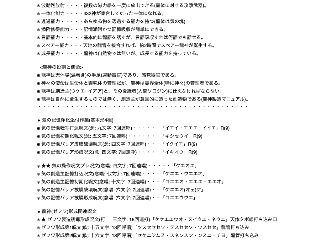 その昔、新米ソロジンのKENが創造主のセザナ神と対戦する為に、大量の岩石渦(渦直径が数mm)を集めて「チビ龍神(岩石渦龍神)」を作り出していたが、渦巻に改良を加えて龍神を作り出すことが、「ソロジン」つまり龍王の龍王たる証だった。人間王国の「高天原創造主世界」では創造主は皆呪文を打って仕事をする。その為、どうしても「呪語」を発音できる「57音言語」が必要不可欠であり、また呪文の記憶バンクとして龍神の能力が必要だった。龍神は天体場に特殊な記憶場(セトクネ場)を持ち、数十億本もの呪文を整理して詰め込んでいて、必要に応じて即座に引き出す事が出来た。また他の記憶をコピーしたり、それを保管したり、他に添付したりする事も容易にできた。その為、創造主の手足ばかりでは無く、口や目や耳などの感覚器官としての役割も果たしていた。また龍神の体は大きくはなれないが、反対に小さくする事ができた。自身の体長の約1/8万サイズまで縮小ができる。チビ龍神の場合は体長が1/100mmのサイズだが、その1/8万サイズまで小さくなれるので、ウイルスよりも小さくなれて、ウイルスや毒分子や癌細胞などを破壊する事もできた。