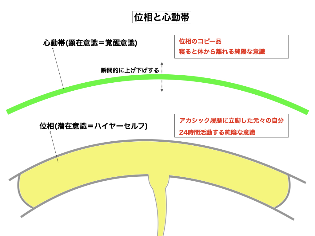 成長した人間(大人)は普段、心意識(顕在意識=覚醒意識)の方で物を考え記憶して判断している理由から、自己の位相意識(潜在意識=ハイヤーセルフ)の存在には余り気付いていないのが普通です。一般的に位相意識とは「夢の中に登場して来る自分」と言えば、遠からず当たっていますが、心の活動がまだ未発達な幼少期の頃の自分や、頭を空白にしている時の自分や、寝ぼけた状態の時の自分が位相意識だと言えます。両者の大きな違いは、心意識の方は肉体が寝てしまうと体から離れてしまうものですが、位相意識の方は24時間活動しており、決して眠る事は無いと言う事実です。位相意識はこの世に誕生する前からの本来の自分であり、アカシック履歴に立脚した元々の自分であって、戸籍原本の如き純陰的な存在です。それに対して、心意識とは、この戸籍原本のコピー品であり、後から芽生えて成長して来る後天的な意識(自分)であって、人間の人間たる由縁を象徴する「純陽なる意識」であると言えます。人間に取って重要な事は「陽の意識(心意識)」を健全に発達させる事なのですが、残念ながら陽は脆(もろ)くて崩れ易く、また移ろい変異して軌道から離脱する場合が多い事から、原点回帰ではありませんが、本来の自分を見つめ直す事も時には必要であると思います。