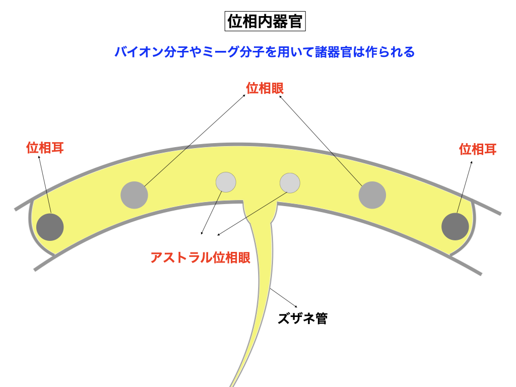 位相の基礎骨格は4種類の「アストラル素材(ネイ材、キア材、ニキ材、キカ材)」で構成されており、これらの骨組みの中に位相空間があり、位相の内壁は「ギエ材」に電子を配列させた電磁基盤によって裏張りされており、一種の電子袋を呈しています。ズザネ管とタボ線は基本的には一種の電子管ですが、構成素材には「シエ材(被膜材)」と「ニオ材(結合材)」が使われています。これらのアストラル素材を生産するのが高天原創造主の役割、そしてこれらの材料を使って霊界を作り上げるのが龍神達の仕事でした。これらの霊界位相群を最初に開発し、動物や人間を創り出したのが「ポリープ創造主」、人間王国はその伝統的な手法を受け継いでいるに過ぎません。「ギエの電磁基盤」が生み出す磁気粒子(電子の3倍の大きさ)が位相内に自然発生し、やがてそれらの磁気粒子が互いに結合し合って「電子バイオン(磁気粒子の20倍の大きさ)」が誕生して来ます。これらのバイオン分子に担当の渦磁場十二神が自己の意識記憶を転写してやると、バイオン分子が更に凝集し合って「部分記憶体(ミーグ)」が大量に形成され、それらのミーグが更に集合して機能的に分派し、電子位相そのものが一人の人間の意識を奏でる生命当体へと進化して行きます。