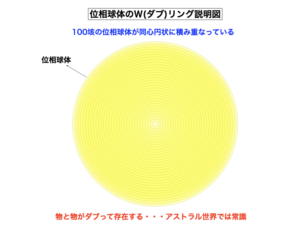 人間生命の本源当体とは「位相」に他ならなく、その内部に存在する「電子バイオン」こそ「我(自分)」を認知する源であると言えます。その電子バイオンを突き詰めれば、個々の磁気粒子に入力された「意識核」こそ「我の元因子」だと言う事になりますが、ともかく生物の自己意識の源とは「位相」にあると言う認識で間違いはありません。位相(いそう)と言う言葉は物理的には「位相運動(phasic movement)」などの「変位値」を表現する用語ですが、生命位相はもともと磁場に固定されたもので、磁場と一緒に全体的に回転運動はしているものの、それ自体の存在位置が変化する訳ではありません。その様な意味では「位相」を「位層」と表現しても別に構わないのですが、確かに「層状」には連なってはいるものの、一つ一つの位相は実は「球体」であって、その球体が同心円状に積み重なっていると解釈するのが正解です。物質世界では「W(ダブ)リング」など言う現象は有り得ない話ですが、アストラル世界では物と物がダブって存在するのは当たり前の常識、龍神の如く432匹がたった1匹に集約できる所が、アストラル世界の妙技なのです。