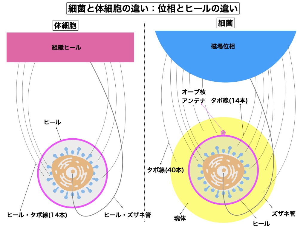 自然界の「細菌」と、動物体内の「体細胞」の違いは、位相ズザネ管が入力していない事から「魂体」が無い事が一番の大きな違いです。前者は自律生命体、後者は非自律生命体(機械系生命)である為に、「魂体オーブ核」が備わっておらず、心発動が出来ない、つまり自律運動を起こせない細胞体と言えます。バイ菌も体細胞も基本的な構造は何も変わらないのに、片方は「生き物」であり、片方は「生き物」では無く、体の従属物であって疑似生物に過ぎないと言う話です。ただ、体細胞の場合は機能分化の関係上、ヒール・ズザネ管とヒール・タボ線を有する細胞もありますが、そもそもヒール層と生命位相は全くの別物であり機能が異なります。ちなみに、魚類でも猿でも一緒ですが、脊椎動物の一個の肝細胞は1本のヒール・ズザネ管と、14本のヒール・タボ線から成り立っています。ヒール・ズザネ管では魂体が形成されない為に、体細胞はどれも自律運動を起こす事ができない事になります。また、自然界の中では植物系の菌類の様にコロニーを築く仲間がいて、その様な場合はコロニーにズザネ管が入力されて、コロニー魂体(茎や根)が形成されています。そのコロニーの内部で「胞子」が誕生し、コロニーから胞子が外へ吐き出されると、個々の胞子自体にズザネ管が入力されて単体菌として活動を始めます。