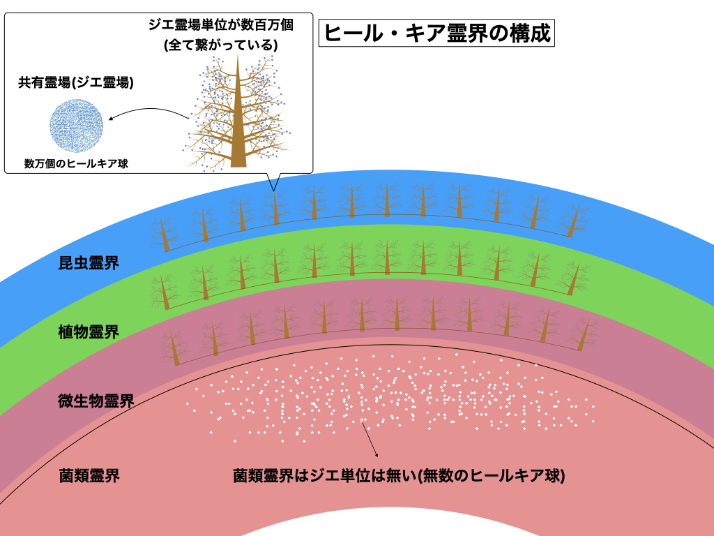 自然霊界は前回のブログでも少し説明していますが、正確な表現を使えば「ヒール・キア霊界」であり、最上段の昆虫霊界の場合は一粒の直径が55cm程度のヒールキア球が数万個単位で一つの共有霊場(ジエ霊場)が形成されて、そのジエ単位が数百万個も存在しています。当然、ジエ単位は全て互いに繋がっている状態です。また、昆虫層の下に広がる植物霊界も一緒の構成であり、一粒の直径が40cm程度のヒールキア球が数百万個単位で一つのジエ単位が形成され、更にそれらのジエ単位が数百万個も連鎖して植物霊界が形成されています。また植物層の下の軟体動物や環形動物などの微生物霊界も構成は全く一緒であり、一粒の直径が20cm程度のヒールキア球がジエ単位で配列しています。一番下の領域に存在する「菌類霊界」だけが、共有霊界の形式では無く、一粒の直径がテニス・ボールサイズのヒールキア球が無数に並んでおり、その一個一個から細菌ズザネ管と細菌タボ線が伸びています。それに対して、上三つの霊界は霊界の下部に共有ズザネ管やタボ線が配備されおり、それらが個々の昆虫や植物やミミズなどと接続されています。昆虫霊界の一個のヒールキア球を覗き込むと、外被膜にヒールが存在し、その内部にキア材層が裏張りされて空洞空間に存在するのが、天体バイオン、つまり気の粒(サイ粒子)の磁気が入っています。昆虫も植物も微生物も細菌も「地球」そのものの意識なのです。