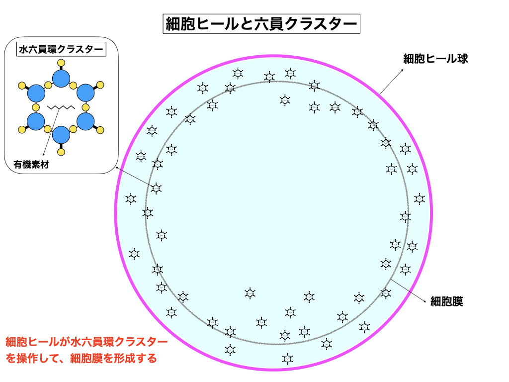 さて、以上の説明から推測できると思いますが、原始海洋とはいわゆる「有機物のスープ」であり、そこに渦磁場十二神達が「細胞ヒール」を注入し、細胞の「核」となる浮遊核酸を捕獲させます。細胞ヒールは水の六員環分子を操作してアミノ酸を細胞内に取り込んでは、中心核のDNA鎖に配列させて「タンパク質」を合成して行くのです。そうして最初に細胞膜を作って外界から独立した安定環境を築き上げ、徐々に細胞内器官を発達させて内部を充実させて行きます。細胞が一応の完成を見ると、今度は個々に菌類霊界と接合させて、自力で細胞分裂を繰り返し自己増殖が可能な自律生命体を作り出すのです。細胞ヒールが水分子を操作して細胞内に必要な物質を取り込むと言う作業は、今現在も皆様の体内で普通に行われている現象であり、これは当たり前の細胞の生理作業です。細胞膜が示す摩訶不思議な現象である「エンドサイトーシス(飲食作用)」と「エキソサイトーシス(開口分泌)」ですが、これは一体誰が行なっている「技」なのでしょうか。皆様にはそう言う認識は無いかも知れませんが、細胞内部いや生体内部の全ての化学反応とは細胞ヒールと細胞バイオンが織り成すものなのです。