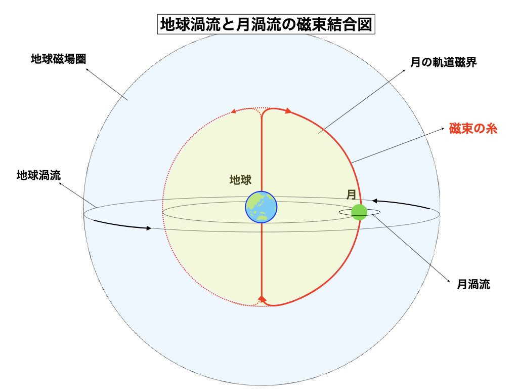 惑星に取って衛星とは「子星」に相応し、その関係は「親子関係」であるものの、惑星軌道を周回している期間内(惑星の渦磁場圏内にいる期間)は、むしろ「属星(伴星)」であって、惑星の従属物であると解釈できます。母親の胎内にいる子供だと言う意味から、早い話が「胎児」見たいな物でしょうか。惑星と衛星の関係は陽子の渦磁場の中を周回する一個の内包電子と全く同じ意味になります。今から約20億年前、月のスピンが停止し、月は「死の星」と変じましたが、それまでは月は生きていました。その昔、子星である月も母星と一緒の渦磁場を呈する一個の天体(重力星)だったのです。少し難しい話になりますが、地球と月の物理的な関係性を紐解けば、下図に示す様な関係性であり、地球渦流の中心磁束流と月の中心磁束流が一体化し、両者は一本の「磁束の糸」で結ばれていました。まるで水素原子の陽子と陽電子の関係性と一緒です。外側から地球磁場圏を覗き込めば、磁場圏内部には月の軌道磁界が形成されており、地球は月の磁界にスッポリと包まれている状態に見えます。「地球の生物は月の磁界の中で育てられた」と言っても過言ではありません。