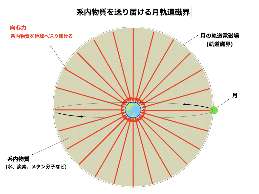 難しい話がもう少し続きます。有電荷粒子の一点を中心とした軌道運動(角運動)とはすなわち「軌道電磁場(軌道磁界)」を作る運動ですが、同時に力界を形成する運動でもある為に、形成された「軌道電磁場」からは回転の中心点に対して「向心力」が作用します。もし、月の軌道電磁場の圏内に浮遊物体が在れば、その物体は月本体では無く、回転の中心点に存在する地球へ落下して行く事になります。無論、月自身にも重力があることから、物体が月の重力圏内に侵入すれば、その物質は月に落下して行く事になりますが、軌道磁界に発生する大半の系内物質(水や炭素やメタン分子など)を月は地球へ送り届ける結果となります。地球が膨大な水分子や有機材料を獲得できた理由は、つまり地球が「水の惑星」に成長できた理由とは、大きくて立派な衛星の月を抱えていた事に起因します。と言う事は、月は惑星と遜色の無い大きさの立派な天体ですが、残念ながら地球の子星として誕生してしまった事から、自己の成長よりも「お家」の為に貢献しなければならず、長男坊である月は自己を犠牲にして親元に貢いだ事になります。従って、地球と月の関係性には微妙な「因果関係」が成り立ちます。