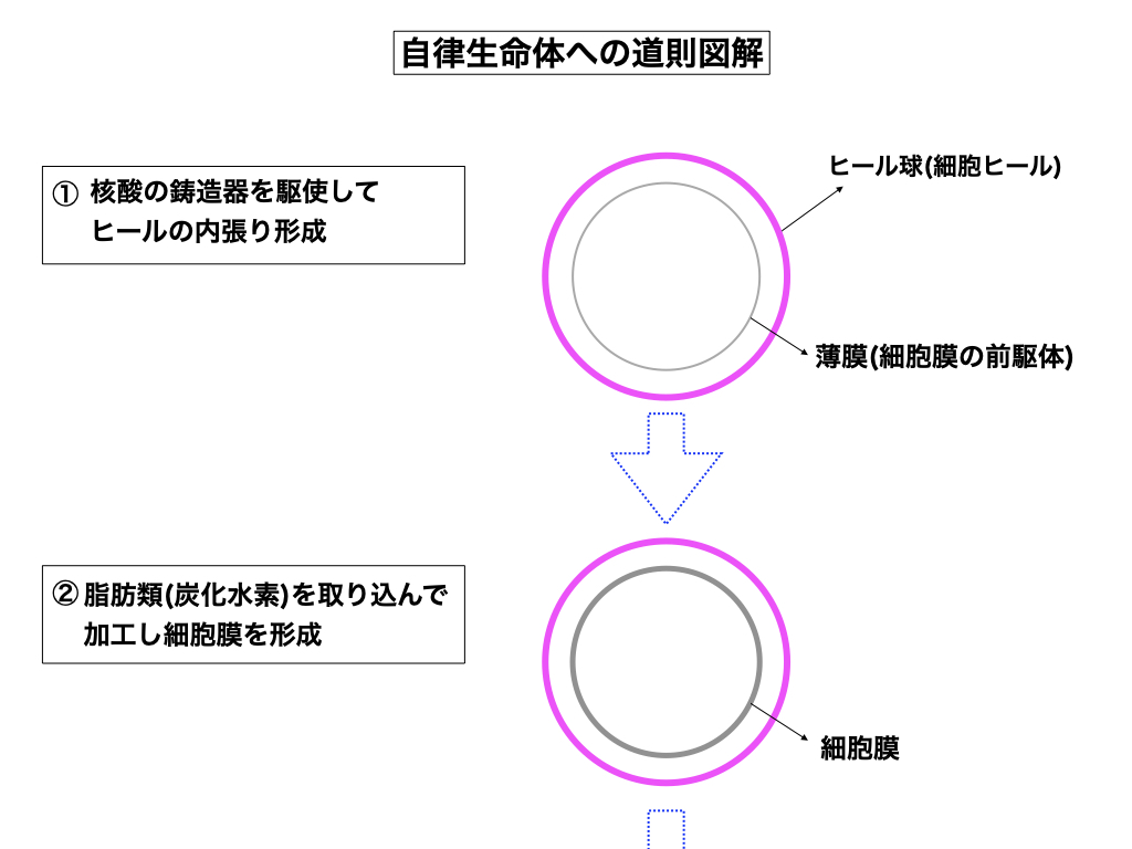 今から約55億年前、地球の原始海洋に大量のヒール球(細胞ヒール)が注入されて、それらが原始核酸を捕獲すると、ヒールは海水に浮遊するアミノ酸分子を内部に取り込んで蛋白質合成に取り掛かります。ヒールが核酸の鋳造器を駆使して最初に形成するのがヒールの内張り(裏張り)に相当する薄膜成分です。これは後の細胞膜の前駆体と言えるものです。そのヒール球の内張りが完成すると、次に取り掛かるのが脂肪類(炭化水素)を内部に取り込んで加工し、細胞の外皮である「細胞膜」を完成させる作業です。先ずは、細胞膜を完成に導かないと外界から独立した内部環境を築けないし、その細胞膜に「コリン電線」を這わして「細胞電磁場」を生み出さないと「生き物(細胞)」にはならないからです。細胞ヒールが「自律生命体」へと進化する為には、「細胞電磁場」と「電子バイオン」が必要であり、そうした細胞内の物理環境を整備しないと「細胞オーブ核(核小体=仁)」が形成されず、またオーブ核が形成されないと、細菌位相のズサネ管を呼び込む事も出来ないのです。更にズザネ管が細胞に入力し「細菌オーラ球(魂体)」が形成されないと、心動帯もキャッチ出来ず、細胞は自律運動体にはならない訳です。