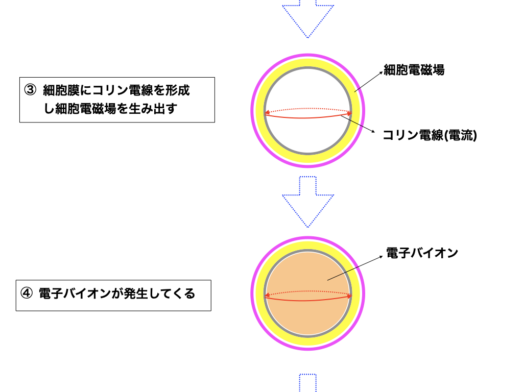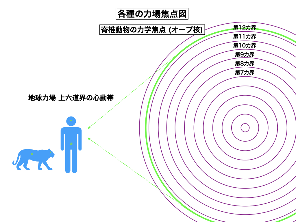 一個の素粒子(電子や核子)とは、それ自体が天体の如き渦巻であり、力場と磁場を兼ね備えた作用体(独立した生き物)です。その個々の単位を外界から操作して素粒子の運動を制御しているのが、原子や分子の「外磁場」と「外力場」です。今度はその原子や分子を操作して、原子や分子の運動を制御しているのが、その上の「外磁場」と「外力場」です。例えば、生物体の原子や分子はその外磁場に当たる「細胞電磁場」や、外力場に当たる「細胞ヒール」などによって、原子や分子の運動や反応がコントロールされている事になります。また一個の細胞はその上の組織や器官などの外磁場や外力場によって、細胞の運動や活動がコントロールされている事になります。仮に人間や動物を一単位と仮定すれば、生物の運動そのものを牛耳っているのが、外磁場に当たる「磁場位相」や、外力場に当たる「心動帯」なのです。人間の意識で細胞内部の原子や分子の運動には関与できませんが、その代わりに細胞電磁場や細胞ヒールが代行してくれている訳です。つまり「上の場が下の場をコントロールする事」、これぞ生命構造の成り立ちであって、「上の者が下の命を生かす行為」が「生命」の「仕組み」なのです。