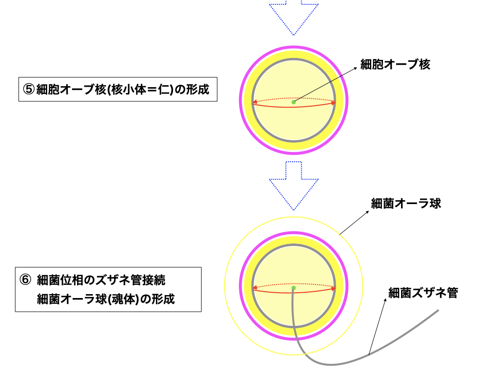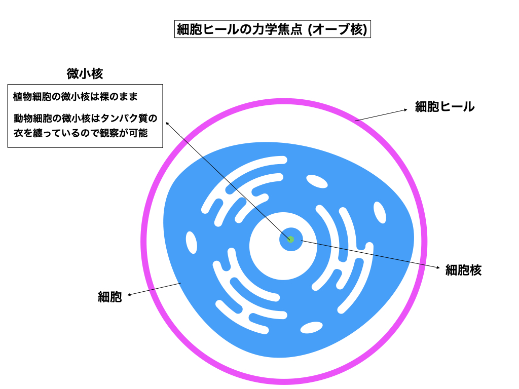 宇宙生命論では「力の場」の力学焦点を「オーブ核」と総称していますが、一般に脊椎動物のオーブ核とは地球力場の上六道界の心動帯の事です。それに対して昆虫や植物や微生物や菌類が有するオーブ核とは大変小さく、地球力場の下六道界(自然霊界)の心動帯の事です。一個の細胞には細胞核の中心部に「核小体(仁)」として細胞オーブが配当されており、それは細胞自身の外部運動を司っています。では、細胞内部(ヒール場)の運動を司る力学的な「焦点」とは一体何かと言えば、実はそれが「微小核(細胞ヒールのオーブ核)」であり、中心体の内部に存在するものです。植物の場合は裸のオーブ核のままなので、アストラルの微小核を目で確認する事は難しいのですが、動物細胞の場合はタンパク質の衣を纏っている事から「中心体」として観察する事が可能です。細胞内部の力仕事には、この微小核が必ず絡んでおり、mRNAを運ぶのも、排出物を運ぶのも、あるいは栄養物を取り込むのにも、バイゾン分子やバイオン分子や水分子を動かして仕事をしているのです。そうした物理的な背景も知らずして、生物学を語ることは出来ません。
