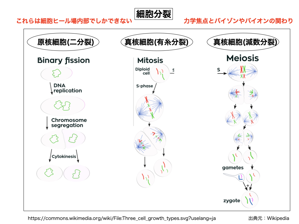 ところで、生物の生物たる所以は「増殖する」事にあります。単細胞が自己の複製を作って頭数を増やすのも増殖の一種ですが、同じ増殖でもキメラ細胞(分身細胞)を大量に作り出して、多細胞生物の体細胞を作って行くと言う「発生増殖」も増殖の一種です。どちらも増殖する事に変わりはありませんが、なぜ染色体(DNA)が分割されて、細胞質が二つに分離されるのか、考えれば考える程、不思議な現象だと言わざるを得ません。目で見える物質だけを観察しても、なぜ二本鎖のDNAが分割されて増殖して行くのか、その物理的なメカニズムを推測する事は不可能です。細胞分裂の際に「なぜ中心体(centrosome)」が細胞の両極に移動して、紡錘糸が出現しDNA鎖を牽引できるのでしょうか。そもそも中心体って一体その正体とは何なのでしょうか。また植物細胞には中心体が無いのに、ちゃんと細胞分裂ができますが、そこにはどんな「力」が作用しているのでしょうか。実は、DNA分割にしても、細胞分裂にしても、あるいは葉緑体DNAや、ミトコンドリアDNAの分割増殖にしても、こうした行為は細胞ヒール場の内部でしか出来ない芸当であって、そこにはヒール場の力学焦点とバイゾンとバイオンが深く関わっています。