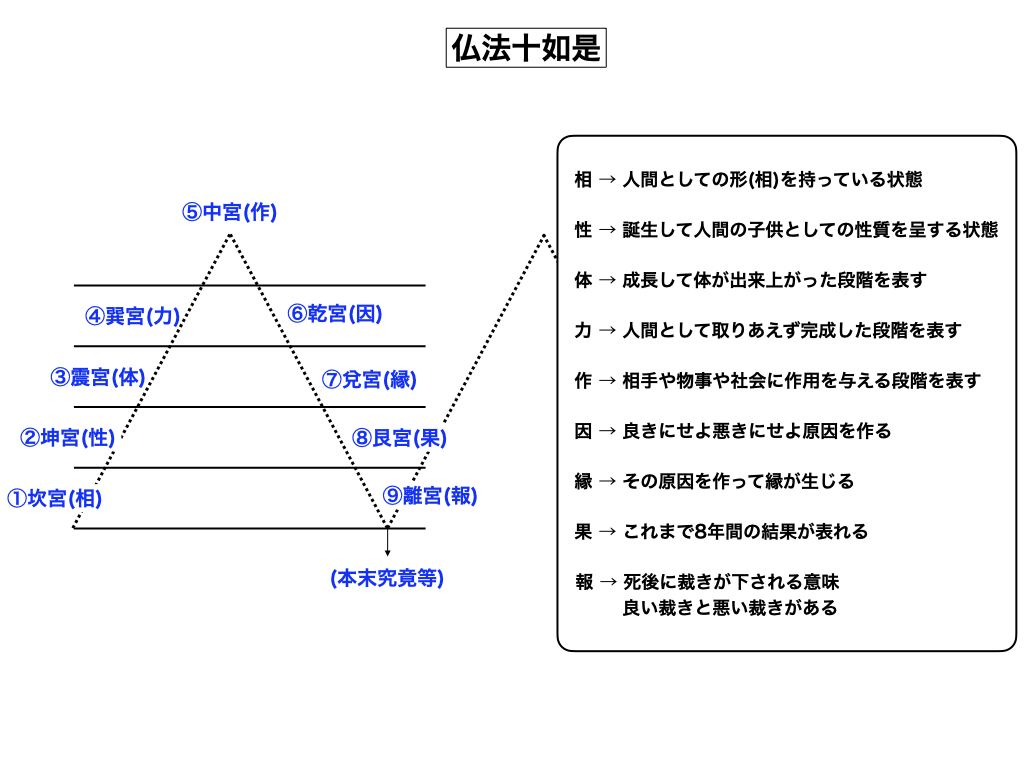植物が刻む「年輪」の如く、人間が刻む年齢にもその一年一年に意味が在って、更に「九年周期単位」でも生命バイオリズムの句節が訪れています。極端な言い方をすれば、人間は朝に誕生して夜に死ぬと言う成長サイクルを繰り返しながら、九日単位でもまた九年単位でも死を迎えていると言えば驚くでしょうか。別に本当に死ぬ訳ではありませんが、こうした運動周期は天体の運動原理に由来するもので、これは力線運動(例えば重力)にもまた波動運動にも関係しています。地球人にこうした運動概念を伝えてくれたのが「プレアデス星人」ですが、ウクライナの「プレアデス言語居留区」から分派したアーリア人がインドにもたらした仏教系哲学(ウパニシャッド哲学: プレアデス仏法)には「十如是(正確には九如是)」と言う概念が語られています。ちなみに、仏法哲理の「十如是」の図を下記に示しましたが、これは人間成長に準(なぞら)えたものです。人間成長が「相(そう)」「性(しょう)」「体(たい)」「力(りき)」「作(さ)」「因(いん)」「縁(えん)」「果(か)」「報(ほう)」と言った九つの段階を繰り返して(本末究竟等)、9年単位で推移して行く様を表現したものです。