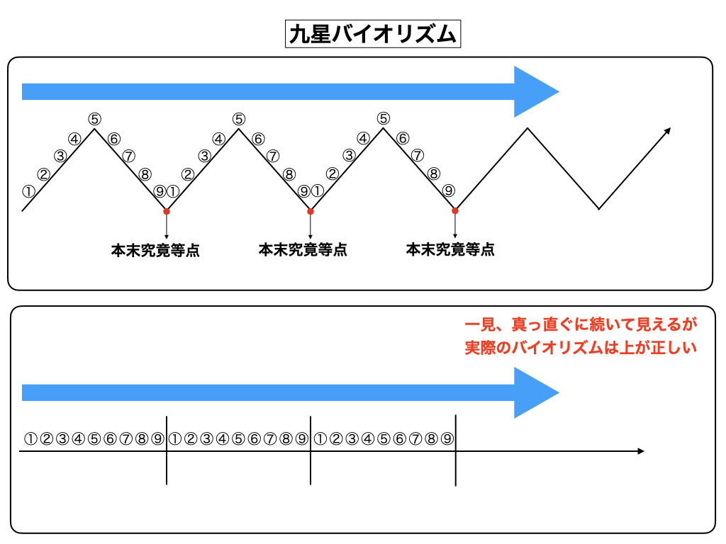 さて、九星バイオリズムの具体的な話に移りますが、人間の生涯の一年一年に意味が在って、一年刻みで生命は成長して行くものです。まるで植物が「年輪」を刻みながら成長して行くのと大変良く似ています。その九星バイオリズムを図で表現しますと下図の様になります。いわゆる「一白坎宮(かんきゅう: 相)」「二黒坤宮(こんきゅう: 性)」「三碧震宮(しんきゅう: 体)」「四緑巽宮(そんきゅう: 力)」「五黄中宮(ちゅうきゅう: 作)」「六白乾宮(けんきゅう: 因)」「七赤兌宮(だきゅう: 縁)」「八白艮宮(ごんきゅう: 果)」「九紫離宮(りきゅう: 報)」と言う九つの段階を経て一句節が終了すると言った内容です。当然、この九句節が終了すると、次の段階の九句節を歩むことになりますが、重要な問題は九句節の最後の段階(離宮)に於いて、九年間の総決算を迫られて良きにせよ悪しきにせよ結論が下されて、一応の決着や整理が着くと言った特徴がある事です。これは一般的には「前厄」と呼ばれる年廻りのことですが、早い話が九年間の人生航路の「死期」を迎える時が「前厄」であり、次の年廻りの「坎宮」の年から新しい九句節の最初の一歩が始まります。この原理は直進運動がただ真っ直ぐに伸びて行く訳では無く、たとえ力線運動であろうと九句節のバイオリズムを刻みながら進んでいると言う普遍法則の話なのです。