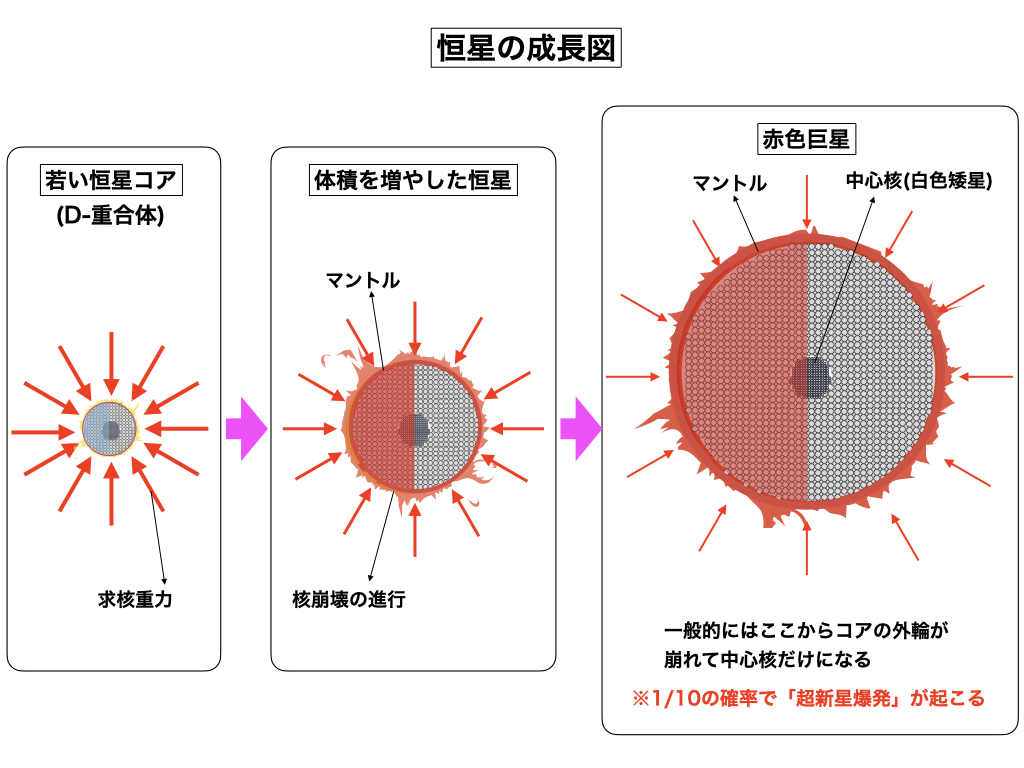 太陽コアは重水素ガス(D2)がヘリウム結合で配列した「D-重合体(重列元素)」の核崩壊の熱エネルギーで燃えており、核融合反応で燃えている訳ではありません。従って、ここでは地球科学のいい加減な嘘知識はバッサリと切り捨ててもらって、銀河一般常識の方で太陽の成長行程を考えて見たいと思います。天体の渦運動が求核重力を産み出して、渦巻の中心点にガス分子を圧縮して行く訳ですから、時間が経過すれば渦巻の回転力が落ちて、その分重力が減退して行くのは理解して頂けるものと思います。強烈な重力で圧縮されている超密度のコアが、重力の段階的な減衰に伴って核崩壊が進行し、コアそのものが体積を増して来る事は誰でも納得できる筈です。太陽の一生は赤色巨星へ推移するのが最終段階であり、やがてコアの外輪が崩れて中心核(白色矮星)だけを残して消滅するのが一般的な星の終わり方です。しかし、確率的には1/10程度ですが、赤色巨星の段階で急激に渦巻の回転力が落ちた場合は「超新星爆発」という派手な終わり方をする星もあります。