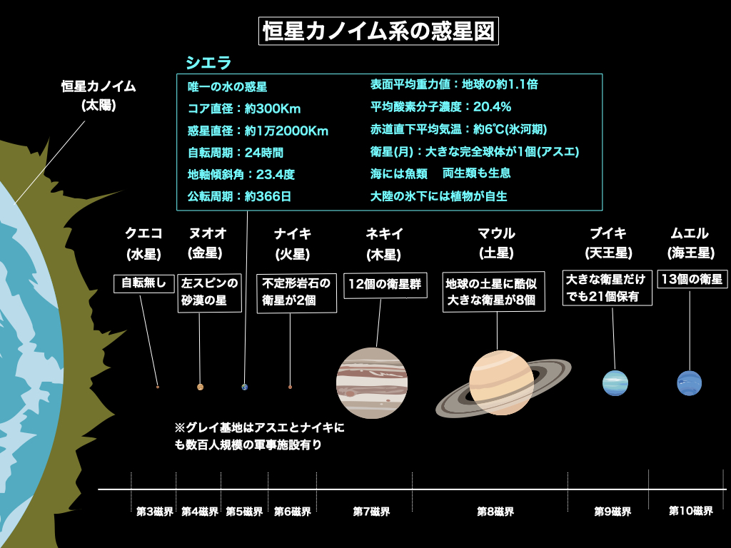 恒星カノイムの第9磁界を公転するのが、第七惑星(天王星)である「ブイキ」です。ブイキの質量は天王星とほぼ一緒ですが、傾斜軸のズレは少なく公転面に対しては約20度(天王星は96度の傾斜)ほど傾いています。自転周期は約12時間であり、カノイム系の中では4番目に大きな惑星です。衛星数は多く大きな衛星だけでも21個ほど確認できます。恒星カノイムの第10磁界を公転しているのが最終惑星である第八惑星(海王星)の「ムエル」です。この星も地球の海王星と良く似ており、ネキイとマウルに次ぐ大きさであり、ブイキよりも少し大きな惑星です。自転周期は9時間、衛星数は13個です。以上が恒星カノイムの構成ですが、冥王星の様な捕獲惑星は存在せず、至って標準的な惑星構成でしょうか。さて、恒星カノイムの唯一の「水の惑星」である第三惑星の「シエラ」ですが、完全球体の月(アスエ)を一個抱くこの惑星の現在の物理情勢は、コア直径は約300km、惑星直径は約1万2000km、自転周期は24時間、地軸の傾斜角は23.4度、公転周期は約366日、表面平均重力値は地球の約1.1倍、平均酸素分子濃度は20.4%、赤道直下の平均気温は約6度C、赤道以外の海は氷で閉ざされている状態です。赤道直下でも地球の北極圏と遜色の無い気温でしょうか。グレイ基地は「シエラ」以外にも、月(アスエ)と火星(ナイキ)に数百人規模の軍事施設があります。尚シエラ基地に関する具体的な情報は「2022年11月19日付け」のブログ(セジス・グレイの基地配置: その2)を参照にして頂ければと思います。