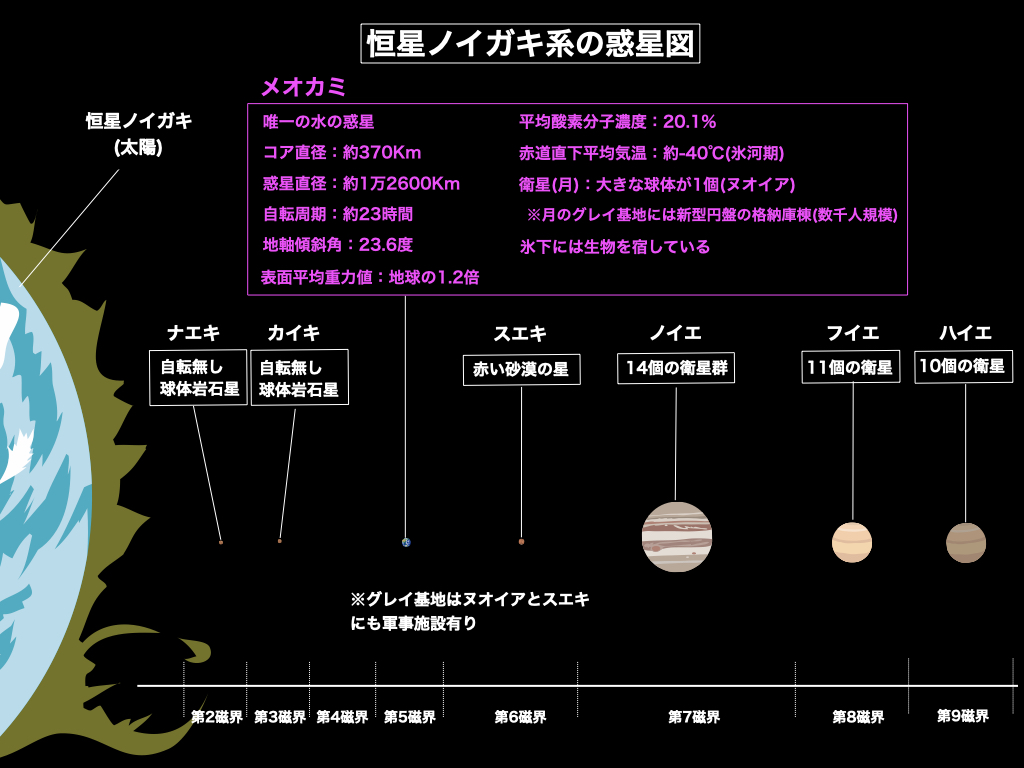 恒星ノイガキの外部惑星群は全部で三つ、最初は第7磁界の軌道を周回する第五惑星の「ノイエ」であり、地球の木星に相当するこの惑星が一番大きな惑星です。ノイエにも縞模様が有って木星を一回り以上小さくした様な大きさの惑星ですが、自転周期は約7時間という高速スピンを呈していて、抱える衛星群の数は14個と成ります。次にノイガキ系の第8磁界を周回する第六惑星は「フイエ」と呼ばれており、地球の土星に相当する惑星ですが、特徴的な「環」の姿は無く、サイズ的には天王星や海王星クラスの大きさの惑星です。また第9磁界を周回する第七惑星は「ハイエ」と呼ばれる惑星であり、フイエもハイエも双子の様に良く似ており、自転周期も共に6時間、そのサイズもほぼ一緒です。フイエには11個、ハイエには10個の衛星が存在します。恒星カノイムも恒星ノイガキも共に「第四氷河期」の最中であり、太陽コアの燃焼度(核反応の進行度)が青春期に在って、両星とも青白く見えるのが特徴です。重力圧が最も強い氷河期ではあるものの、それぞれの第三惑星は氷の下に生物を宿しており、これから高等生物が芽吹くと言う、今は冬眠中の段階です。ちなみに、惑星メオカミのコア直径は370km、惑星直径は12600km、表面重力値は地球の約1.2倍、平均酸素分子濃度は20.1%、平均気温は赤道帯でも−40度C、自転周期は約23時間、地軸傾斜角度は23.6度と言う物理環境です。メオカミ基地の情報はブログを参照にして頂ければと思いますが、月(ヌオイア)と第四惑星のスエキにも基地が在って、特に月基地には新型円盤の格納庫棟が存在し、数千人規模の大型基地があります。