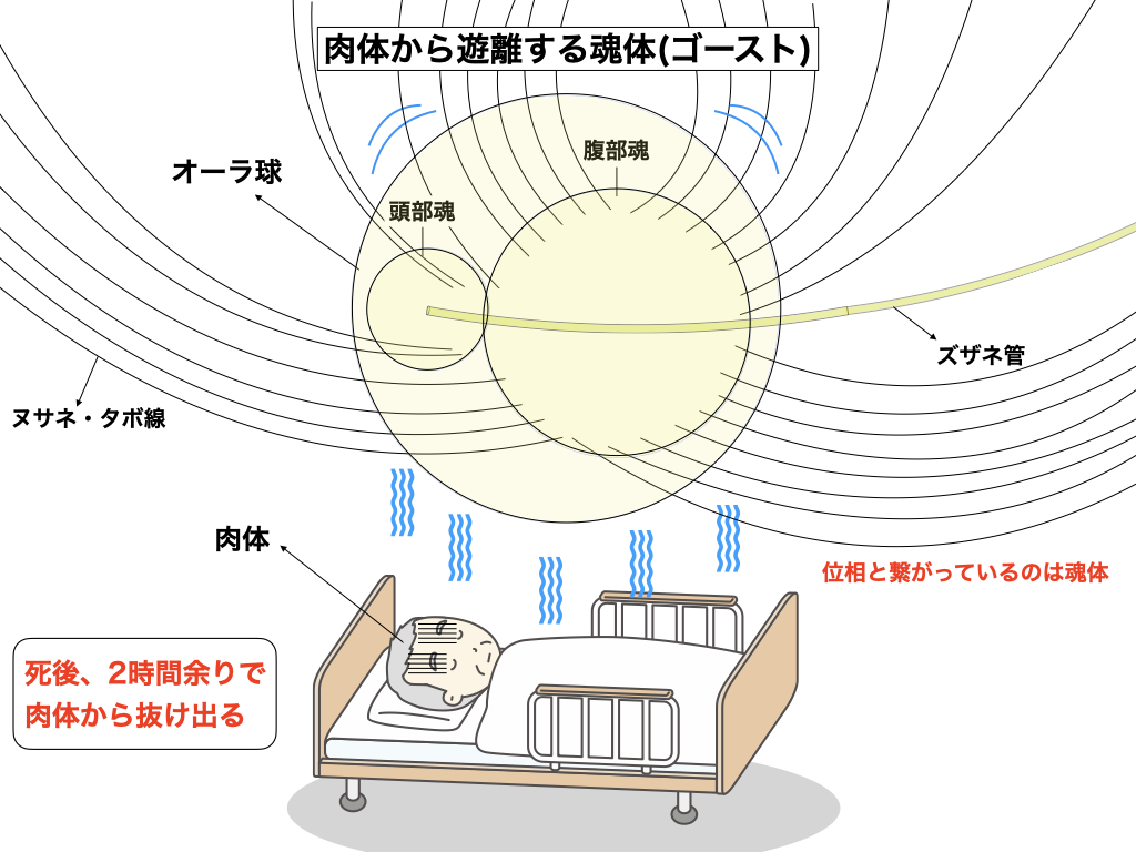 誕生したばかりの赤ちゃんの体の周囲に「魂体」が形成されるのは「満四ヶ月後」の話です。魂体形成と同時に赤ちゃんは体の自律運動を起こして、自らの意思で「ハイハイ運動」を始めます。実は魂体が形成されないと肉体は動き出す事が出来ないのです。つまり肉体の本質、その存在意味、その本懐とは「自律運動を起こすこと」であって、魂体とは肉体に運動を引き起こす為に必要な運動器官の一種なのです。もし赤ちゃんの体に魂体が形成されなければ、その赤ちゃんは永久に歩き出す事は無く、また言葉を話す事も、手足を自由に動かす事も出来ません。ただそこに横たわっているだけの肉体ならば、親が死ぬまで面倒を見なければならず、取り敢えず生きてはいるものの、もはやそれは人間の顔をしたタンパク質の塊に過ぎません。人間の人間たる証(自意識に基づく自律運動)とは、肉体では無く、魂体の方に在って、だからこそ魂体は人間の「たましい」であると言える訳です。人間の死後、2時間余りで肉体から抜け出る「魂体(ゴースト)」、その魂体を良く観察するとズザネ管やタボ線が入力されており、空の上の位相と繋がっていたのは肉体では無く魂体の方だった事実が分かります。当然、横たわる骸(むくろ)の方に、本人はおらず、話しかけて答えて来るのは魂体の方なのです。人間の本質が肉体にあるのか、それとも魂体の方にあるのか、正しい認識を持って欲しいと思います。