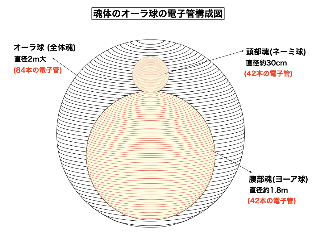 「天霊地魂」と言う言葉がありますが、天の意思で地の魂体が操作されて肉体が動くと言う意味であり、魂体とは肉体運動を導く為の器官に他ならなく、現代風に表現すれば「遠隔操作用の電磁場」であると解釈できます。ゲルマン文明は文明歴が浅く現象の上っ面だけを見て早急な結論を導いてしまいがちですが、宇宙の事象の奥行きは大変深く、若い科学者が単純な数式を駆使して理解できる様な代物ではありません。魂体は空の上の位相(霊体)が肉体と結合してから作り上げる物で、非常に複雑な行程を経て赤ちゃんの周囲に時間を掛けて形成される物です。その惑星のサイズに応じて位相のサイズも異なり、またズザネ管のサイズも変化するし、更に個人の体格に応じて膨張や収縮をする為に一様ではありませんが、地球の場合は魂体の直径は平均約2m大の球体であり、基本的に84本の電子管から構成されるアストラル器官です。魂体の構成は二重構造を呈していて、外枠球体の方を「オーラ球(84本)」と称しており、その内部に形成される「頭部魂(ネーミ球: 42本)」と「腹部魂(ヨーア球: 42本)」も電子管で形成されています。ちなみに、医学系の「ヒール」「オーラ」「オーブ」「ネーミ」「ヨーア」と言ったアストラル組織の名称は、地球語に馴染を持つプレアデス言語に統一しており、魂体に関しては古代王国言語、神語、ベテルギウス言語など、いずれも用いておりません。