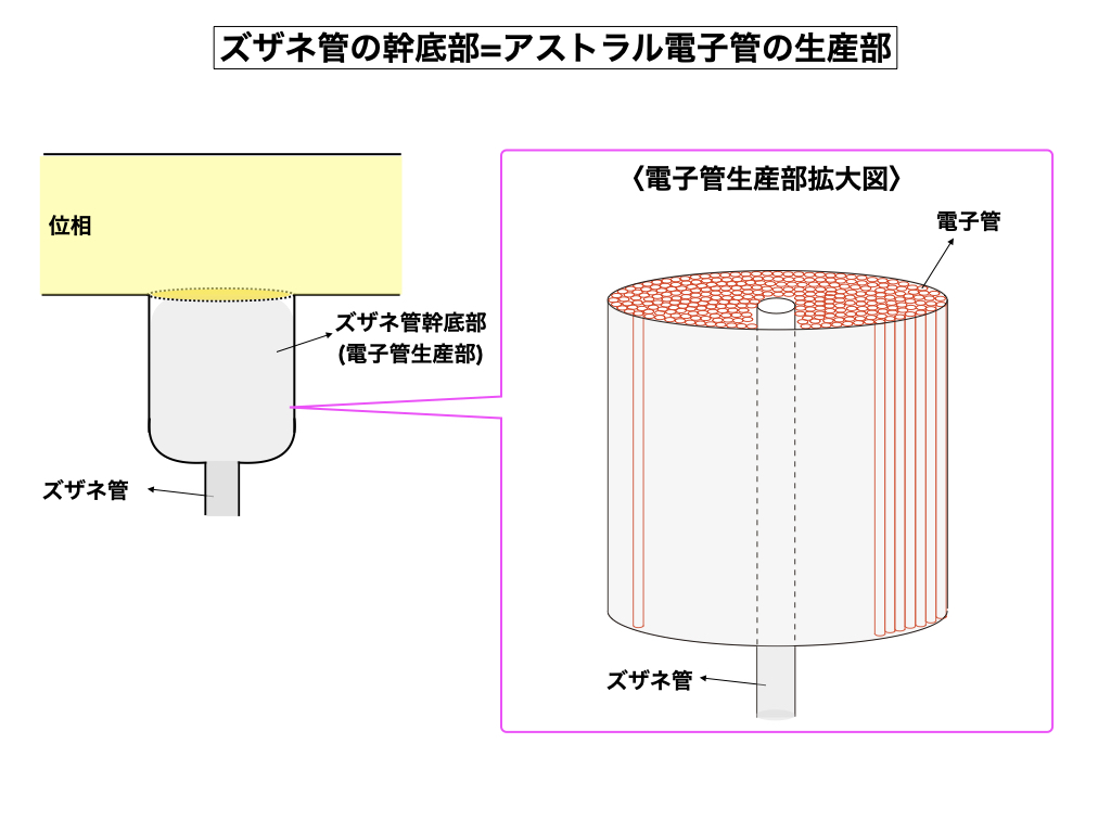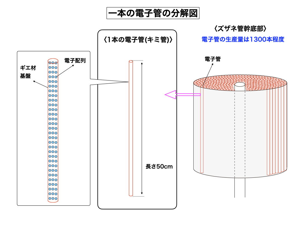「魂体形成」に関する情報は基本的に個々の生命位相の中に「プログラム・データ」があらかじめ仕込まれており、それに基づいてズザネ管の先端から吹き出す力束線が形成する「力場」が自動的に「電子管」を繋いで魂体を形成して行きます。作られて行く順番は「腹部魂(ヨーア球)」が最初に形成されて、次に「頭部魂(ネーミ球)」が形成され、最後に全体を包み込む「オーラ球」が形成されます。つまり、ズザネ管の先が風船の様に膨らんで力場を形成し、そこにズザネ管の底部(電子管生産装置)から電子管が供給されて、それらの電子管を配列させて魂体が形成されて行く事になります。電子管は長さが50cm程度のギエ基盤の中に電子を配列させたアストラル電子管であり、プレアデスではこの電子管の事を「 キミ管」と称している様です。位相形成用の電子管と、魂体形成用の電子管は太さが異なり、前者はマジックペン大の太さ、後者はボールペン大の太さであり、電圧を付加してやると、いずれも電子が配列して電流が流れます。またズザネ管の幹底部は魂体形成用の「電子管製造装置」になっており、これは自動装置なのですが、生産量が1300本程度あり、魂体形成に一回分を使い果たすと、次の魂体用のスペア量を用意するのに約100年間の時間が掛かると言われています。